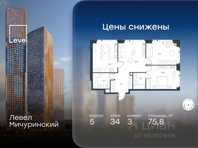 Цена указана с учётом скидки при 100%-й оплате, несубсидированной ипотеке, рассрочке (кроме программы "Рассрочка 0%"). В жилом квартале, расположенном на границе с природным заказником "Долина реки Очаковки", продаётся 3-комнатная квартира площадью 75.30 кв.м с отделкой white box. Квартира расположена на 23 этаже 30-этажного корпуса 3 в жилом комплексе бизнес-класса Левел Мичуринский (компания Level Group/Левел групп). Отличная транспортная доступность: - от 10 мин. пешком до станции метро "Мичуринский проспект" - 15 мин. пешком до станции метро "Аминьевская" - 7 мин. на авто до МКАД - 10 мин. на авто до ТТК - 15 мин. на авто до Москва-Сити Продуманный архитектурный проект: - Выразительная архитектура от известных бюро: корпуса 1-6 - бюро СПИЧ, корпуса 7-13 - архитектурное бюро Анатолия Борисова; - Из окон открываются живописные виды на парки, Москва-Сити и МГУ; - Высокие потолки до 6,35 м; - Стильные лобби с окнами в пол и высокими потолками до 4,7 м; - С каждого этажа дома на лифте можно спуститься в подземный отапливаемый паркинг. Расположение: Жилой комплекс Левел Мичуринский строится в одном из самых зелёных районов Москвы - Очаково-Матвеевское. Этот уголок столицы идеален для поддержания здорового образа жизни. В шаговой доступности от проекта находятся заказник "Долина реки Очаковки" - 1 мин. пешком и Очаковский парк - 7 мин. пешком. На велосипеде можно добраться до таких парков, как "Событие", парк Олимпийской деревни, парк 50-летия Октября и парк Школьников. В 15 минутах езды на авто расположено более 30 детских садов (из них 14 в пешей доступности), 32 школы (из них 13 в пешей доступности) и 14 вузов. Также в ближайшем окружении - более 25 медицинских учреждений, 11 спортивных клубов и 22 продуктовых супермаркета. Внутренняя инфраструктура: На территории жилого комплекса строится три детских сада и школа. На первых этажах домов откроется супермаркет, фитнес-центр, ресторан, кафе и другие сервисы. Подземные этажи займут паркинги: трёхуровневые - в этапах 1 и 2, одноуровневый - в этапах 3 и 4. Преимущества проекта: - 4,5 га благоустроенной территории с видовым мостом, уличным кинотеатром, зонами для тихого отдыха, работы, уличных тренировок, площадки для петанка, футбола, настольного тенниса и пляжного волейбола. - Дизайнерские лобби с панорамным видом на двор, мойками для лап животных и комфортными зонами ожидания. - Безопасность жителей: круглосуточное видеонаблюдение всех зон общего пользования (лобби, лифты, паркинги, детские площадки), система контроля доступа, управление видеодомофоном через мобильное приложение, единый ключ доступа на территорию жилого комплекса. - Технологии и комфорт: высокоскоростной вайфай в лобби и на придомовой территории, автоматическая система контроля и учёта ресурсов, абонентская связь с консьержем, распознавание номеров автомобилей при въезде в паркинг и выезде из него. Купить 3-комнатную квартиру с евроремонтом на улице Озерная в Москве.