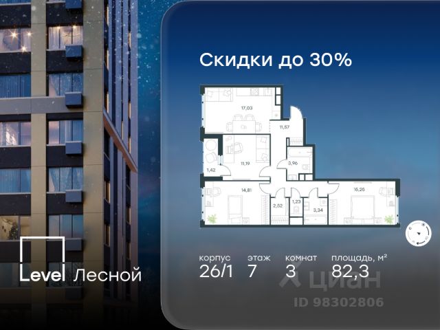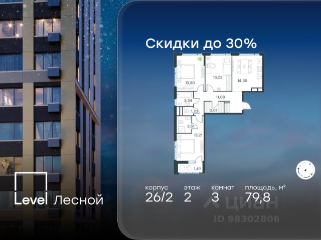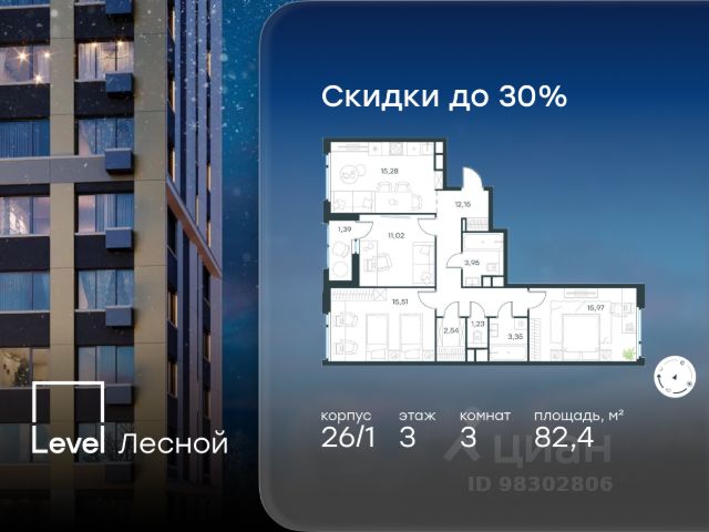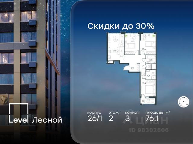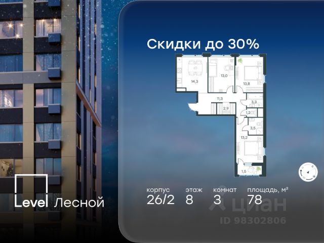 Цена указана с учётом скидки при 100%-й оплате, несубсидированной ипотеке, рассрочке (кроме программы "Рассрочка 0%"). В районе, утопающем в густой зелени лесов, многочисленных парков и скверов, продаётся 3-комнатная квартира площадью 74.40 кв.м с отделкой white box. Квартира расположена на 10 этаже в жилом комплексе комфорт-класса Level Лесной (компания Level Group/Левел групп). Отличная транспортная доступность: - 25 мин. пешком до станции метро "Пятницкое шоссе"; - 28 мин. на автобусе до станции метро и МЦД-2 "Волоколамская"; - 11 мин. на авто до МКАД; - 25 мин. на авто до ТТК. Продуманный архитектурный проект: - Концепция проекта Level Лесной от бюро СПИЧ; - Высотность комплекса до 15 этажей с уникальными видами на лесные массивы и город; - Высота потолков до 3 м; - Современные окна высотой до 1,6 м, в части квартир предусмотрены окна в пол. Высота подоконников 0,6 м; Расположение: Level Лесной строится в зелёной зоне ближайшего Подмосковья, г.о. Красногорск в посёлке Отрадное. Шаговая и автомобильная доступность до метро и больших транспортных артерий города. За 25 минут вы дойдёте до станции метро "Пятницкое шоссе", а за 20 минут на машине сможете доехать до станции метро "Тушинская". Район окружен роскошной зеленью лесов и парковых зон, занимающих территорию свыше 1 000 гектаров. Помимо благоприятной экологии, здесь множество возможностей для активного отдыха и поддержания физической формы. Облагороженная территории с полностью развитой инфраструктурой. На территории проекта находится детский сад и школа "Светлые Горы", которая входит в список лучших частных школ от Forbes Education (по данным на 2023г.). Кроме того, в пешей доступности расположено ещё 8 детских садов, а также запланировано открытие современной муниципальной школы. В непосредственной близости находятся сетевые супермаркеты и локальные магазины, аптеки, клиники, почта, библиотека, салоны красоты, рестораны, спортивные и творческие секции, развивающие детские центры. В 12 минутах пешком расположен торговый парк "Отрада" с продуктовым и строительным гипермаркетами, магазинами, кинотеатром и развлечениями для детей. Внутренняя инфраструктура: Мы знаем, как важно, чтобы магазины и сервисы были всегда рядом. В сданных корпусах Level Лесной уже расположена полностью готовая развитая инфраструктура. На первых этажах корпуса 27 предусмотрено ещё 14 коммерческих помещений. Благоустройство: Продуманное пространство и аура приватного европейского городка рождают чувство лёгкости и расслабления у каждого, кто попадает на территорию проекта. Концепцию общественных площадок разработали в партнёрстве два архитектурных бюро: Highlight Architecture и SCAPE. В безопасных дворах без машин каждый обязательно найдёт себе место для вдохновения, отдыха и спорта.