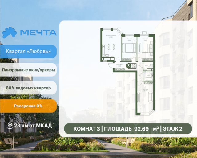Рассрочка 0% от застройщика! Продается трехкомнатная квартира в квартале "Дружба" жилого комплекса "Мечта". Общая площадь квартиры: 91.8 кв. м, этаж 4 из 5. Срок сдачи: 2 квартал 2026 г. Отделка: Получистовая ОСОБЕННОСТИ: - Просторная кухня-гостиная - Застекленная лоджия - Просторная прихожая - 3 спальни - 2 санузла - Высота потолка: 2.7 метра Квартал "Дружба" состоит из пяти пятиэтажных домов с несколькими подъездами. Каждый дом оборудован широкими окнами, которые обеспечивают максимальный доступ естественного света и открывают прекрасный вид на окружающую природу. Квартал отличается большими застеклёнными лоджиями, которые позволяют наслаждаться свежим воздухом и красивым видом, не покидая своего жилища. Жилой комплекс "Мечта" расположен в 23 км от МКАД по Дмитровскому или Ленинградскому шоссе. ТРАНСПОРТНАЯ ДОСТУПНОСТЬ: - 15-20 минут на общественном транспорте до МЦД-1 "Лобня" - 30-35 минут на общественном транспорте до метро "Физтех" - 45-50 минут до станций метро "Савеловская" или "Белорусская" - 30 минут на автомобиле до Москвы Инфраструктура включает в себя муниципальную школу и детские сады, кабинет врача общей практики, множество кафе и ресторанов, а также различные спортивные и детские площадки. В пешей доступности от жилого комплекса расположены лес и три реликтовых озера — Долгое, Круглое и Нерское, а также реки Альба, Уча и Волгуша. Территория жилого комплекса закрыта для посторонних, находится под охраной и патрулируется. На въезде расположен КПП. Камеры видеонаблюдения работают круглосуточно на всей территории. Вы и ваши дети будете чувствовать себя в безопасности.