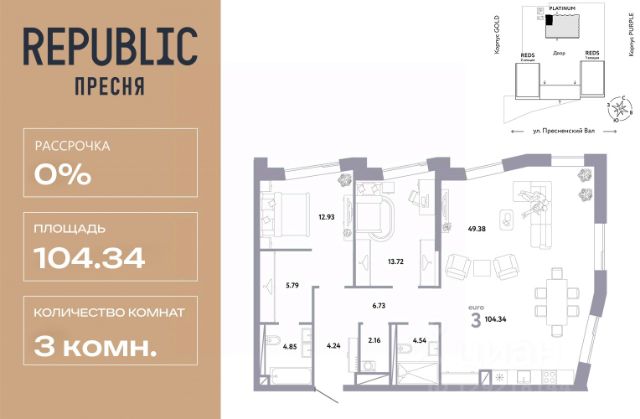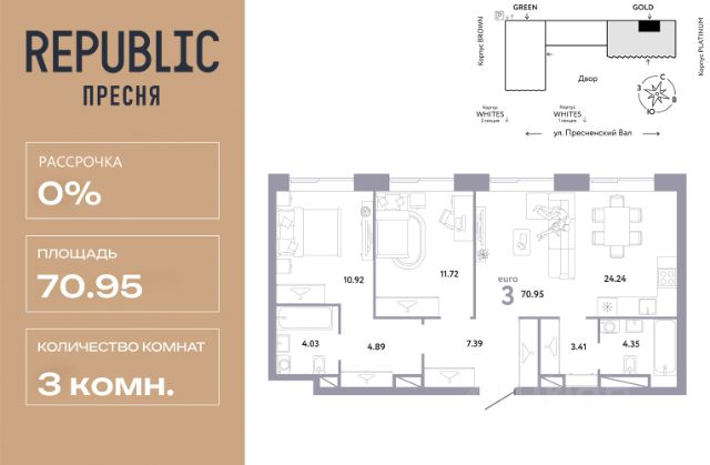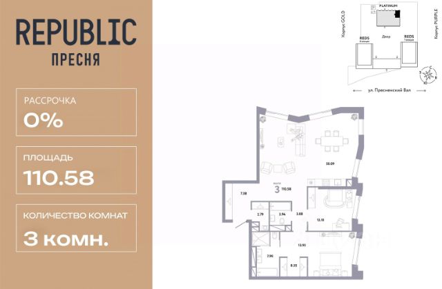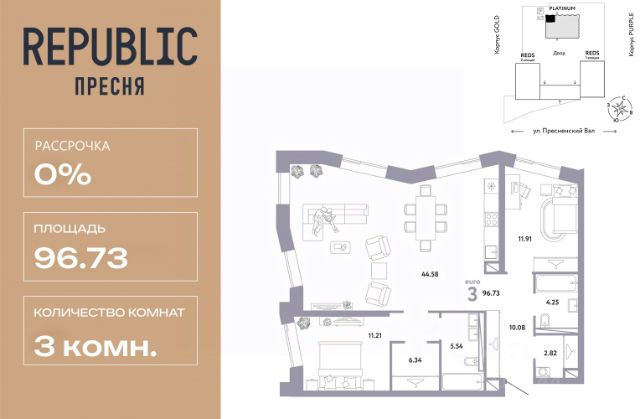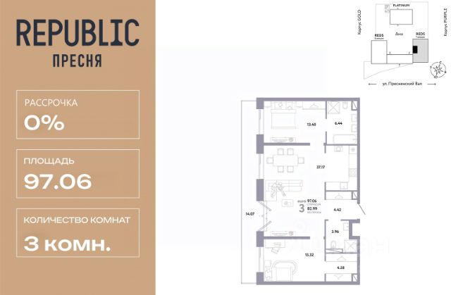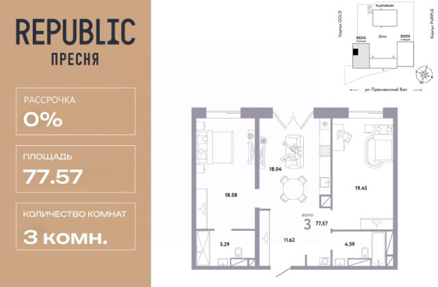 Новая квартира в ЖК "Republic" напрямую от федерального застройщика "Страна Девелопмент". Продается 3комнатная квартира на 8 этаже от застройщика Страна Девелопмент. Площадь квартиры 74,74 кв. м. Дизайн-квартал "Republic" — новый проект премиум-класса в Москве. 10 жилых башен и 4 восстановленных здания локомотивного депо образуют уникальное пространство. "Republic" — место, где вы ощутите гармонию истории и современности. Детский сад, SPA-комплекс с бассейном, гастрономический и шопинг-центры, собственный бульвар и яркие арт-пространства — для жителей предусмотрены все элементы премиального комфорта. Преимущества Уникальная жизненная среда, где инфраструктура включает гастрономию, SPA-комплекс с термами, образовательные и развлекательные заведения, арт-пространство и шопинг-аллеи. Двор от британского бюро "Gillespies": на 4 гектарах закрытого двора расположится 7 игровых зон для разных возрастов с ручьем и сухим фонтаном, арт-галерея под открытым небом и большой прогулочный бульвар. Лобби с террасой в башнях "Reds" — лаконичное пространство галереи-лобби, где можно проводить деловые и дружеские встречи, не нарушая приватности квартиры. В тёплое время года не остаётся пустующей терраса на крыше, которая привлекает непринуждённой атмосферой и прохладительными напитками в баре. Клубная гостиная — стильное пространство оборудовано кухней и залом для торжеств на 40 человек, а для того, чтобы побыть наедине с собой, почитать книгу или провести онлайн-встречу в гостиной оборудована мастерская с библиотекой. Уникальные форматы квартир, где можно реализовать любой жизненный сценарий: от стильного офиса в двухэтажной квартире до угловых лотов с просторными гостиными. А эксклюзивные пентхаусы с высокими потолками и панорамными окнами дарят захватывающие виды на Москву.. Отделка Квартиры сдаются без отделки или в формате White box. При отделке White box уже были выполнены все шумные и грязные работы руками наших специалистов: произведена разводка электричества с установкой подрозетников, установлены откосы из гипсокартона, устроена стяжка пола с шумоизоляцией. Способы покупки Сотрудники "Страна Девелопмент" будут сопровождать вас на каждом этапе сделки, помогут получить одобрение по ипотеке или снизить ежемесячный платеж. - ипотека - рассрочка - с использованием материнского капитала - 100% оплата наличными