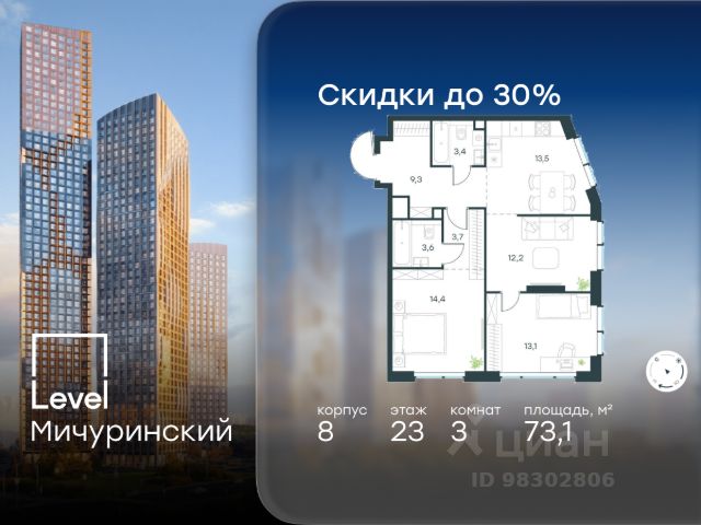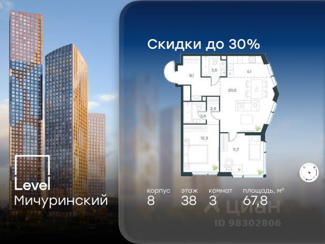 Цена указана с учётом скидки при 100%-й оплате, несубсидированной ипотеке, рассрочке (кроме программы "Рассрочка 0%"). В жилом квартале, расположенном на границе с природным заказником "Долина реки Очаковки", продаётся 3-комнатная квартира площадью 60.40 кв.м без отделки. Квартира расположена на 7 этаже 42-этажного корпуса 2 в жилом комплексе бизнес-класса Level Мичуринский (компания Level Group/Левел групп). Отличная транспортная доступность: - от 10 мин. пешком до станции метро "Мичуринский проспект" - 15 мин. пешком до станции метро "Аминьевская" - 7 мин. на авто до МКАД - 10 мин. на авто до ТТК - 15 мин. на авто до Москва-Сити Продуманный архитектурный проект: - Выразительная архитектура от известных бюро: корпуса 1-6 - СПИЧ, корпуса 7-13 - Borisov Architects; - Из окон открываются живописные виды на парки, Москва-Сити и МГУ; - Высокие потолки до 6,35 м; - Стильные лобби с окнами в пол и высокими потолками до 4,7 м; - С каждого этажа дома на лифте можно спуститься в подземный отапливаемый паркинг. Расположение: Level Мичуринский строится в одном из самых зелёных районов Москвы - Очаково-Матвеевское. Этот уголок столицы идеален для поддержания здорового образа жизни. В шаговой доступности от проекта находятся заказник "Долина реки Очаковки" - 1 мин. пешком и Очаковский парк - 7 мин. пешком. На велосипеде можно добраться до таких парков, как "Событие", парк Олимпийской деревни, парк 50-летия Октября и парк Школьников. В 15 минутах езды на авто расположено более 30 детских садов (из них 14 в пешей доступности), 32 школы (из них 13 в пешей доступности) и 14 вузов. Также в ближайшем окружении - более 25 медицинских учреждений, 11 спортивных клубов и 22 продуктовых супермаркета. Внутренняя инфраструктура: На территории жилого комплекса строится три детских сада и школа. На первых этажах домов откроется супермаркет, фитнес-центр, ресторан, кафе и другие сервисы. Подземные этажи займут паркинги: трёхуровневые - в этапах 1 и 2, одноуровневый - в этапах 3 и 4. Преимущества проекта: - 4,5 га благоустроенной территории с видовым мостом, уличным кинотеатром, зонами для тихого отдыха, работы, воркаута, площадки для петанка, футбола, настольного тенниса и пляжного волейбола. - Дизайнерские лобби с панорамным видом на двор, мойками для лап животных и комфортными зонами ожидания. - Безопасность жителей: круглосуточное видеонаблюдение всех зон общего пользования (лобби, лифты, паркинги, детские площадки), система контроля доступа, управление видеодомофоном через мобильное приложение, единый ключ доступа на территорию жилого комплекса. - Технологии и комфорт: высокоскоростной Wi-Fi в лобби и на придомовой территории, автоматическая система контроля и учёта ресурсов, абонентская связь с консьержем, распознавание номеров автомобилей при въезде в паркинг и выезде из него.