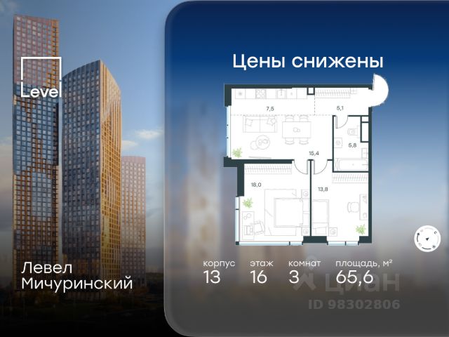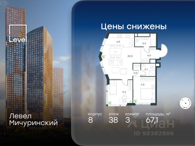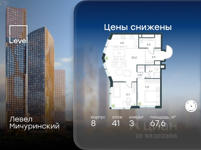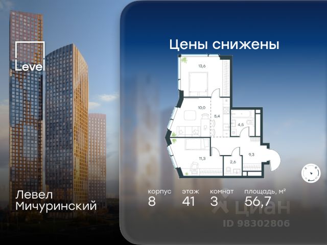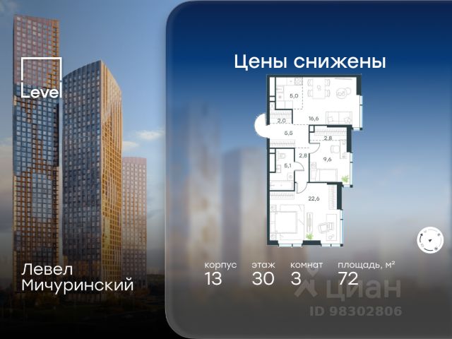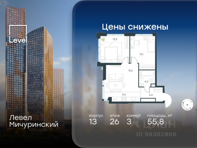 Скидка 35% на все квартиры в жилом комплексе Левел Мичуринский, этапы 3 и 4 (корпуса 7-13). Цена указана с учётом скидки при 100%-й оплате, несубсидированной ипотеке, рассрочке (кроме программы "Рассрочка 0%"). В жилом квартале, расположенном на границе с природным заказником "Долина реки Очаковки", продаётся 3-комнатная квартира площадью 61.90 кв.м без отделки. Квартира расположена на 3 этаже 48-этажного корпуса 8 в жилом комплексе бизнес-класса Левел Мичуринский (компания Level Group/Левел групп). Отличная транспортная доступность: - от 10 мин. пешком до станции метро "Мичуринский проспект" - 15 мин. пешком до станции метро "Аминьевская" - 7 мин. на авто до МКАД - 10 мин. на авто до ТТК - 15 мин. на авто до Москва-Сити Продуманный архитектурный проект: - Выразительная архитектура от известных бюро: корпуса 1-6 - бюро СПИЧ, корпуса 7-13 - архитектурное бюро Анатолия Борисова; - Из окон открываются живописные виды на парки, Москва-Сити и МГУ; - Высокие потолки до 6,35 м; - Стильные лобби с окнами в пол и высокими потолками до 4,7 м; - С каждого этажа дома на лифте можно спуститься в подземный отапливаемый паркинг. Расположение: Жилой комплекс Левел Мичуринский строится в одном из самых зелёных районов Москвы - Очаково-Матвеевское. Этот уголок столицы идеален для поддержания здорового образа жизни. В шаговой доступности от проекта находятся заказник "Долина реки Очаковки" - 1 мин. пешком и Очаковский парк - 7 мин. пешком. На велосипеде можно добраться до таких парков, как "Событие", парк Олимпийской деревни, парк 50-летия Октября и парк Школьников. В 15 минутах езды на авто расположено более 30 детских садов (из них 14 в пешей доступности), 32 школы (из них 13 в пешей доступности) и 14 вузов. Также в ближайшем окружении - более 25 медицинских учреждений, 11 спортивных клубов и 22 продуктовых супермаркета. Внутренняя инфраструктура: На территории жилого комплекса строится три детских сада и школа. На первых этажах домов откроется супермаркет, фитнес-центр, ресторан, кафе и другие сервисы. Подземные этажи займут паркинги: трёхуровневые - в этапах 1 и 2, одноуровневый - в этапах 3 и 4. Преимущества проекта: - 4,5 га благоустроенной территории с видовым мостом, уличным кинотеатром, зонами для тихого отдыха, работы, уличных тренировок, площадки для петанка, футбола, настольного тенниса и пляжного волейбола. - Дизайнерские лобби с панорамным видом на двор, мойками для лап животных и комфортными зонами ожидания. - Безопасность жителей: круглосуточное видеонаблюдение всех зон общего пользования (лобби, лифты, паркинги, детские площадки), система контроля доступа, управление видеодомофоном через мобильное приложение, единый ключ доступа на территорию жилого комплекса. - Технологии и комфорт: высокоскоростной вайфай в лобби и на придомовой территории, автоматическая система контроля и учёта ресурсов, абонентская связь с консьержем, распознавание номеров автомобилей при въезде в паркинг и выезде из нег