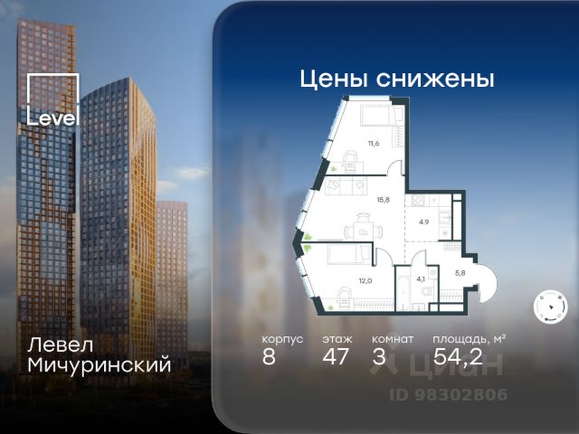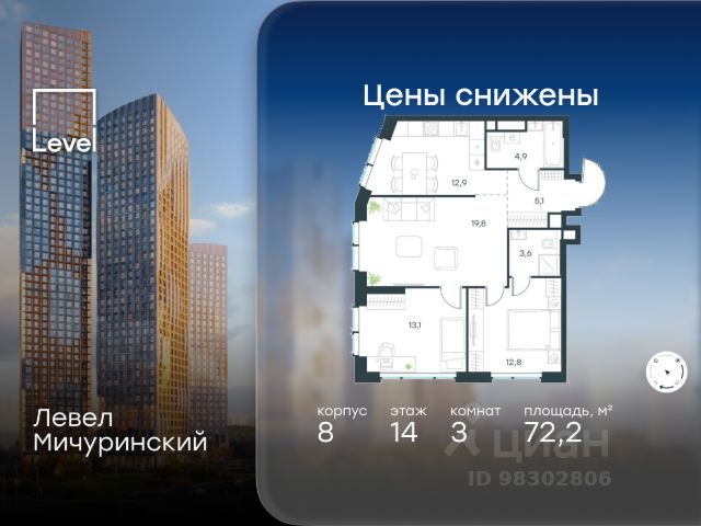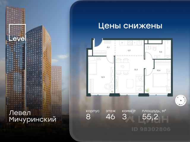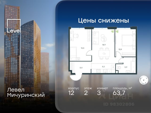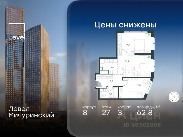 Скидка 35% на все квартиры в жилом комплексе Левел Мичуринский, этапы 3 и 4 (корпуса 7-13). Цена указана с учётом скидки при 100%-й оплате, несубсидированной ипотеке, рассрочке (кроме программы "Рассрочка 0%"). В жилом квартале, расположенном на границе с природным заказником "Долина реки Очаковки", продаётся 3-комнатная квартира площадью 61.90 кв.м без отделки. Квартира расположена на 3 этаже 48-этажного корпуса 8 в жилом комплексе бизнес-класса Левел Мичуринский (компания Level Group/Левел групп). Отличная транспортная доступность: - от 10 мин. пешком до станции метро "Мичуринский проспект" - 15 мин. пешком до станции метро "Аминьевская" - 7 мин. на авто до МКАД - 10 мин. на авто до ТТК - 15 мин. на авто до Москва-Сити Продуманный архитектурный проект: - Выразительная архитектура от известных бюро: корпуса 1-6 - бюро СПИЧ, корпуса 7-13 - архитектурное бюро Анатолия Борисова; - Из окон открываются живописные виды на парки, Москва-Сити и МГУ; - Высокие потолки до 6,35 м; - Стильные лобби с окнами в пол и высокими потолками до 4,7 м; - С каждого этажа дома на лифте можно спуститься в подземный отапливаемый паркинг. Расположение: Жилой комплекс Левел Мичуринский строится в одном из самых зелёных районов Москвы - Очаково-Матвеевское. Этот уголок столицы идеален для поддержания здорового образа жизни. В шаговой доступности от проекта находятся заказник "Долина реки Очаковки" - 1 мин. пешком и Очаковский парк - 7 мин. пешком. На велосипеде можно добраться до таких парков, как "Событие", парк Олимпийской деревни, парк 50-летия Октября и парк Школьников. В 15 минутах езды на авто расположено более 30 детских садов (из них 14 в пешей доступности), 32 школы (из них 13 в пешей доступности) и 14 вузов. Также в ближайшем окружении - более 25 медицинских учреждений, 11 спортивных клубов и 22 продуктовых супермаркета. Внутренняя инфраструктура: На территории жилого комплекса строится три детских сада и школа. На первых этажах домов откроется супермаркет, фитнес-центр, ресторан, кафе и другие сервисы. Подземные этажи займут паркинги: трёхуровневые - в этапах 1 и 2, одноуровневый - в этапах 3 и 4. Преимущества проекта: - 4,5 га благоустроенной территории с видовым мостом, уличным кинотеатром, зонами для тихого отдыха, работы, уличных тренировок, площадки для петанка, футбола, настольного тенниса и пляжного волейбола. - Дизайнерские лобби с панорамным видом на двор, мойками для лап животных и комфортными зонами ожидания. - Безопасность жителей: круглосуточное видеонаблюдение всех зон общего пользования (лобби, лифты, паркинги, детские площадки), система контроля доступа, управление видеодомофоном через мобильное приложение, единый ключ доступа на территорию жилого комплекса. - Технологии и комфорт: высокоскоростной вайфай в лобби и на придомовой территории, автоматическая система контроля и учёта ресурсов, абонентская связь с консьержем, распознавание номеров автомобилей при въезде в паркинг и выезде из нег