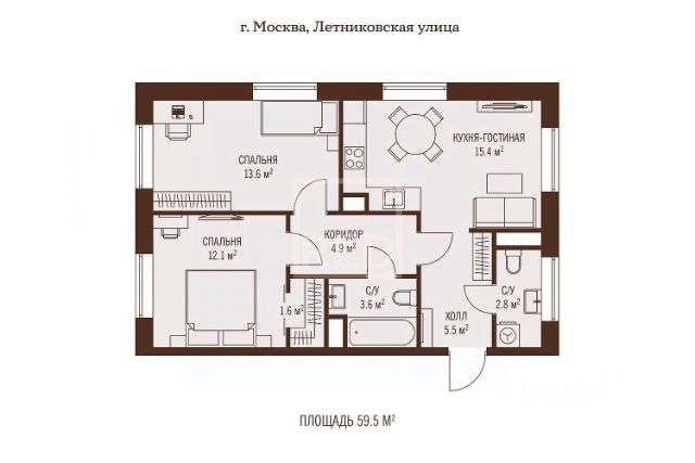 Общая площадь - 59,5 м2. Кухня-гостиная 15,4 м2. Комната 1 13,6 м2. Комната 2 12,1 м2.