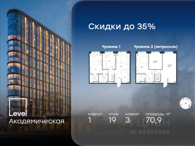 Цена указана с учётом скидки при 100%-й оплате, несубсидированной ипотеке, рассрочке (кроме программы "Рассрочка 0%"). В Академическом районе продаётся 3-комнатная квартира площадью 70.90 кв.м без отделки. Квартира расположена на 19-м этаже 19-этажного жилого комплекса бизнес-класса Level Академическая (компания Level Group). В данной квартире вы можете оборудовать второй этаж (антресоль). Устройство антресольного этажа выполняется собственником самостоятельно как перепланировка квартиры. Нормативная площадь антресоли - не более 40% от площади квартиры. Отличная транспортная доступность: - 1 мин. пешком до станции метро "Академическая"; - 4 мин. на автомобиле до ТТК; - 8 мин. на автомобиле до Садового кольца; - 13 мин. на автомобиле до Кремля. Продуманный архитектурный проект: - современная архитектура от бюро UNK project; - высокие потолки в квартирах до 6,62 м; - окна в пол высотой 2,5-2,68 м с панорамным видом на МГУ, Москва-Сити и другие доминанты Москвы; - квартиры с моллированным остеклением - радиусные окна открывают увеличенный угол обзора; - более 20 вариантов планировочных решений; - уникальные квартиры с собственным патио и возможностью обустройства дровяного камина; - квартиры сдаются без отделки, что открывает свободу для создания интерьера по своему вкусу. Расположение: Камерный проект из 1 корпуса расположен тихом зеленом районе Москвы, в непосредственной близости к центру города. В округе построено 80 детских садов, 50 школ и 30 вузов, 7 из которых входят в топ100 вузов России: МГУ, МГИМО, РАНХиГС, МИСИС, РУДН, РЭУ им. Плеханова и РГУ нефти и газа им. Губкина. Этот район буквально утопает в зелени парков, начиная с уютного Академического в 6 минутах пешком и заканчивая одним из крупнейших в городе парком 50-летия Октября (12 минут на автомобиле). Общая площадь природных объектов в радиусе 2-6 км от дома - 476,5 га. Внутренняя инфраструктура: На территории Level Академическая откроется собственный торговый центр, а для отдыха жителей будут созданы общественные пространства: комфортное лобби с дизайнерской отделкой, окнами в пол и потолками высотой 4,5 м, а также две благоустроенные зоны - территория по периметру здания и пространство на стилобате. Во дворе на стилобате предусмотрены детская и спортивная площадки, коворкинг и лаунж-зона на открытом воздухе. Стилобат украсят скульптуры животных - жирафа, зайца и волка, которые станут ярким акцентом внутреннего двора Level Академическая, подчеркивая близость к музею Дарвина. Процент озеленения территории - 58%. Технологии и безопасность: Жителей Level Академическая не коснется ежегодное отключение горячей воды благодаря собственным центральным водонагревателям. Безопасность гарантирует круглосуточная охрана, безлимитный Wi-Fi, круглосуточное видеонаблюдение. Удобное перемещение внутри комплекса будут обеспечивать 5 лифтов с доступом в паркинг с жилых этажей.