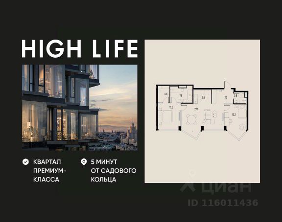 3-к квартира квартира в премиальном комплексе HIGH LIFE на 19-м этаже в 32 этажном здании. Общая площадь 75 кв. м. HIGH LIFE - премиальный проект компании PIONEER, расположенный в 5 минутах от Садового кольца, вблизи исторического Замоскворечья. Авторская архитектура от бюро ADM. Панорамные окна и изящные эркеры открывают виды на Кремль, МГУ, Москва-Сити, Дом Музыки и набережные реки. 70% видовых квартир. Инфраструктура и сервис отеля 5*: • Дизайнерские лобби от Jaime Beriestain Studio • Частный кинозал • Библиотека с камином • Двухуровневый двор-парк 2 га с хвойным лесом и террасами • Залы для йоги и занятий спортом • Массажный кабинет, SPA и бьюти-зоны • Консьерж-сервис Технологии и инженерия: • Центральная система кондиционирования • Дополнительная вентиляция помещений • Буферная мусорокамера • Обеззараживание воздуха • Мониторинг качества воды с дополнительной доочисткой • Дополнительная шумоизоляция • Автоматизированная система передачи данных в УК Системы безопасности: • Датчики движения • Круглосуточное наблюдение • Система доступа с распознаванием лиц • Приложение для наблюдения за квартирой • Система пожарного обнаружения • Датчики дыма и протечек За 24 года на рынке недвижимости компания PIONEER реализовала более 30 проектов. Сегодня PIONEER - девелопер премиальной недвижимости с 4 проектами класса премиум и deluxe. Звоните, и мы с удовольствием расскажем все подробности о нашем замечательном проекте и условиях покупки. Продажа от застройщика.
