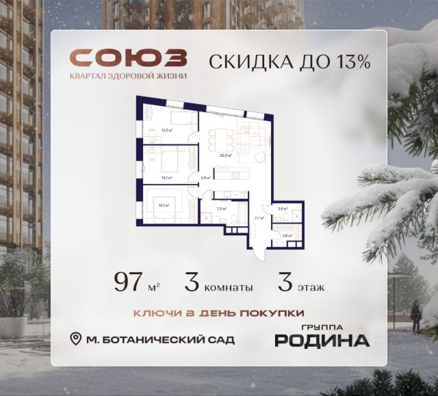 Готовые дома и ключи в день покупки Рассрочка 0% Продаётся 3-комнатная квартира площадью 111.5 м² на 12 этаже в Жилом Комплексе "Союз". Квартал здоровой жизни премиум-класса с рекордным количеством олимпийских видов спорта: - Ледовая арена для хоккея и фигурного катания, - Футбольные поля для тренировок, - Спортивный зал для фехтования, - Бассейн на 6 дорожек, - Центр единоборств, - 4 крытых площадки для настольного тенниса, - 7 теннисных кортов (крытых и открытых), - 4 крытых площадки для сквоша, - Легкоатлетический стадион, - Площадки для баскетбола и волейбола. Уникальные форматы квартир с мастер-спальнями, приватными террасами, балконами, а также пентхаусы с открыточными видами на город. Все квартиры продаются с отделкой Shell&Core и панорамным остеклением. Расположение Пешком: - 2 мин. до парка "Сад Будущего"; - 6 мин. до ст. м. "Ботанический сад"; - 6 мин. до ст. МЦК "Ботанический сад"; - 6 мин. до парка "Леоновская роща"; На автомобиле: - 2 мин. до СВХ (МСД); - 5 мин. до Проспекта Мира; - 10 мин. до ТТК; - 15 мин. до Садового кольца; - 25 мин. до аэропорта "Шереметьево". Благоустройство - собственная спортивная инфраструктура 7 Га; - зона для пикников; - игровые и спортивные площадки для детей всех возрастов; - розарий, а также сосновые, каштановые и дубовые аллеи; - площадки под открытым небом для занятий спортом и йоги; - игровые комнаты для детей; - лаунж-зона для резидентов; - просторная переговорная для деловых встреч; - премиальный ресторан "Шабада" Сосо Павлиашвили с водными арт-объектами на прогулочной аллее, садом ароматных трав и сценой под открытым небом; - кафе, химчистки, аптеки и супермаркеты рядом с домом. Окружение - 8 парков: Сад Будущего, Леоновская роща, Хуамин, Главный ботанический сад РАН, Шереметьевская дубрава, Останкино, парк спорта "Яуза", пойма реки Яуза и музей-усадьба "Останкино"; - 3 ВУЗа: ВГИК, РГСУ, МГПУ; - 12 школ, в том числе: школа 1499 им. И.А. Докукина (топ 100), Brookes Moscow, IThub школа; - 18 детских садов, в том числе билингвальный ALERTUM KIDS; - один из крупнейших океанариумов Европы "Москвариум"; - один из крупнейших в Европе торгово-развлекательных центров "Европолис".