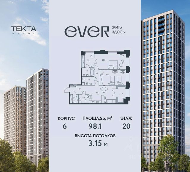 3-комн. квартира в ЖК "Ever" на 4 этаже в 34 этажном здании Корпус 6. Общая площадь: 61.2 кв.м., жилая: 43.9 кв.м. Высота потолков 3.00 м.