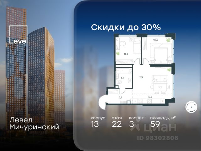 Цена указана с учётом скидки при 100%-й оплате, несубсидированной ипотеке, рассрочке (кроме программы "Рассрочка 0%"). В жилом квартале, расположенном на границе с природным заказником "Долина реки Очаковки", продаётся 3-комнатная квартира площадью 60.40 кв.м без отделки. Квартира расположена на 7 этаже 42-этажного корпуса 2 в жилом комплексе бизнес-класса Левел Мичуринский (компания Level Group/Левел групп). Отличная транспортная доступность: - от 10 мин. пешком до станции метро "Мичуринский проспект" - 15 мин. пешком до станции метро "Аминьевская" - 7 мин. на авто до МКАД - 10 мин. на авто до ТТК - 15 мин. на авто до Москва-Сити Продуманный архитектурный проект: - Выразительная архитектура от известных бюро: корпуса 1-6 - СПИЧ, корпуса 7-13 - Borisov Architects; - Из окон открываются живописные виды на парки, Москва-Сити и МГУ; - Высокие потолки до 6,35 м; - Стильные лобби с окнами в пол и высокими потолками до 4,7 м; - С каждого этажа дома на лифте можно спуститься в подземный отапливаемый паркинг. Расположение: Жилой комплекс Левел Мичуринский строится в одном из самых зелёных районов Москвы - Очаково-Матвеевское. Этот уголок столицы идеален для поддержания здорового образа жизни. В шаговой доступности от проекта находятся заказник "Долина реки Очаковки" - 1 мин. пешком и Очаковский парк - 7 мин. пешком. На велосипеде можно добраться до таких парков, как "Событие", парк Олимпийской деревни, парк 50-летия Октября и парк Школьников. В 15 минутах езды на авто расположено более 30 детских садов (из них 14 в пешей доступности), 32 школы (из них 13 в пешей доступности) и 14 вузов. Также в ближайшем окружении - более 25 медицинских учреждений, 11 спортивных клубов и 22 продуктовых супермаркета. Внутренняя инфраструктура: На территории жилого комплекса строится три детских сада и школа. На первых этажах домов откроется супермаркет, фитнес-центр, ресторан, кафе и другие сервисы. Подземные этажи займут паркинги: трёхуровневые - в этапах 1 и 2, одноуровневый - в этапах 3 и 4. Преимущества проекта: - 4,5 га благоустроенной территории с видовым мостом, уличным кинотеатром, зонами для тихого отдыха, работы, воркаута, площадки для петанка, футбола, настольного тенниса и пляжного волейбола. - Дизайнерские лобби с панорамным видом на двор, мойками для лап животных и комфортными зонами ожидания. - Безопасность жителей: круглосуточное видеонаблюдение всех зон общего пользования (лобби, лифты, паркинги, детские площадки), система контроля доступа, управление видеодомофоном через мобильное приложение, единый ключ доступа на территорию жилого комплекса. - Технологии и комфорт: высокоскоростной Wi-Fi в лобби и на придомовой территории, автоматическая система контроля и учёта ресурсов, абонентская связь с консьержем, распознавание номеров автомобилей при въезде в паркинг и выезде из него.