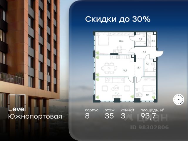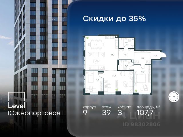 Цена указана с учётом скидки при 100%-й оплате, несубсидированной ипотеке, рассрочке (кроме программы "Рассрочка 0%"). В северной части района Печатники продается 3-комнатная квартира площадью 63.50 кв.м без отделки. Квартира расположена на 8 этаже 16-этажного корпуса 11 в жилом комплексе комфорт-класса Level Южнопортовая (компания Level Group/Левел групп). Отличная транспортная доступность: - 10 мин. пешком до станции метро "Кожуховская"; - 20 мин. пешком до станции МЦК "Дубровка"; - 3 мин. на авто до ТТК; - 13 мин. на авто до Садового кольца; - 15 мин. на авто до Бульварного кольца. Продуманный архитектурный проект: - авторская архитектура от бюро СПИЧ; - уникальные виды на реку, парки и достопримечательности города; - высота потолков в квартирах до 6 м; - окна высотой до 1,87 м с высоким коэффициентом сопротивления теплоотдаче. Расположение: Level Южнопортовая строится в северной части района Печатники - самой приближенной к центру. Здесь будет сформирован новый район "Южный порт", где построят крупный жилой и общественно-деловой центр, аналогичный Москва-Сити. В течение 10-12 лет в этом месте появятся не только жилые дома, но и развитая инфраструктура для жизни и работы. А еще совсем рядом находится набережная Москвы-реки, где планируется построить причалы для речных трамвайчиков и канатную дорогу. Уже сейчас вокруг жилого комплекса работают десятки магазинов и торговых центров, рядом расположено 6 парков, среди которых музей-заповедник "Коломенское". В 10 минутах пешком - 2 муниципальных и 2 частных детских сада, 7 общеобразовательных школ. Внутренняя инфраструктура: Для отдыха жителей в каждом корпусе предусмотрено лобби, оснащенное местами для отдыха, гостевыми санузлами и лапомойками, а в отдельных корпусах - камином. За счёт больших окон и высоких потолков пространства будут наполнены воздухом и светом. На первых этажах жилого комплекса откроются магазины, салоны красоты, фитнес-центр. Для детей строятся собственные детский сад и школа. Благоустройство: Внутренний двор комплекса разработан совместно с бюро GAFA. Основная идея - создать аналог Центрального парка в Нью-Йорке, гармонично сочетая высотные здания и большое изолированное парковое пространство. Вся площадь двора-парка будет огорожена и составит более 2 га, из которых 45% - озеленение. Одним из самых важных ландшафтных элементов здесь станет небольшая речка, наполняющаяся во время дождя. Вокруг неё появится сеть из островов, внутри которых расположатся тематические зоны спорта и отдыха. Технологии и инженерия: - автоматическая передача в управляющую компанию показаний квартирных счётчиков; - телефонная связь, телевидение и интернет на базе оптической мультисервисной сети; - гостевой Wi-Fi в лобби и на территории двора; - единый ключ доступа для входа на территорию комплекса.