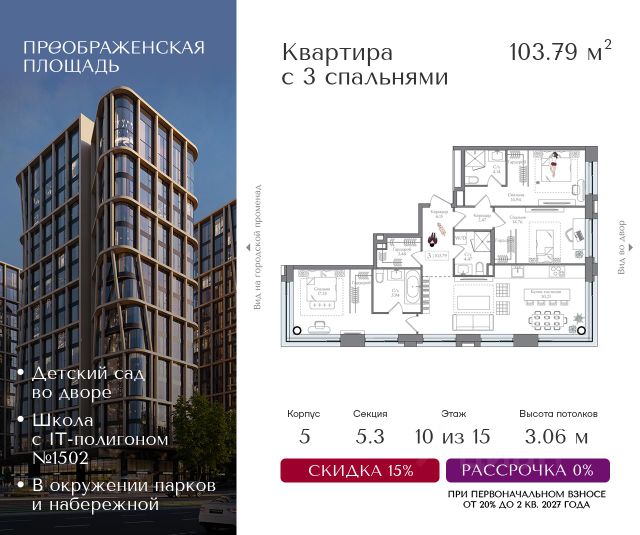 Рассрочка 0% от застройщика. Первоначальный взнос от 20%. Предложение действует до 31 декабря 2025 года Стоимость указана с учетом скидки 10%. Квартира на 10 этаже в жилом комплексе премиум-класса "Преображенская площадь". Общая площадь: 93.27 кв.м. Проект премиум-класса в историческом районе Москвы. До метро "Преображенская площадь" 3 минуты пешком. Квартиры сдаются без отделки и в свободной планировке, чтобы жители могли оформить пространство с учетом своей индивидуальности. Высота потолков от 3,15м, широкоформатное остекление, 3-5 квартир на этаже. Система Умный дом. Дизайнерские лобби. Внутренний двор 1,5 га функциональное и безопасное пространство для игр, работы и занятий спортом. Пешеходный променад для прогулок. Дома переменной этажности. Есть подземный паркинг. Жилой комлекс находится в окружении парков Сокольники, Черкизовский, Измайловский, заповедника Лосиный остров и ВДНХ, а также вблизи пешеходной набережной. Комфортная удаленность от центра: 7 минут на автомобиле до ТТК, 8 минут до Садового кольца, 25 минут до Кремля.