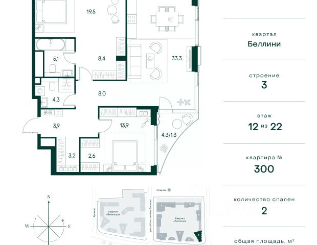 В спальне организована гардеробная, вторая комната свободного назначения (детская, кабинет, гостевая).