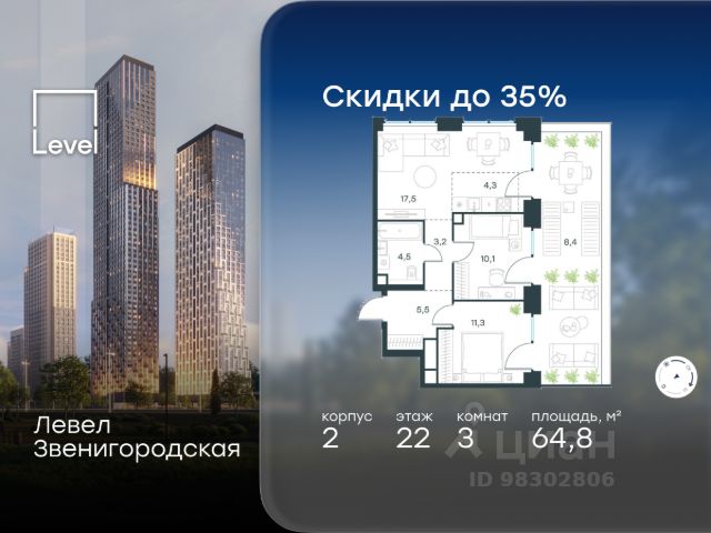 Цена указана с учётом скидки при 100%-й оплате, несубсидированной ипотеке, рассрочке (кроме программы "Рассрочка 0%"). В жилом квартале продаётся 3-комнатная квартира площадью 64.20 кв.м white box. Квартира расположена на 11 этаже 48 этажного корпуса 1 в жилом комплексе комфорт класса Левел Звенигородская (компания Level Group/Левел групп). Отличная транспортная доступность - 5 мин. пешком до метро "Звенигородская" (откроется к окончанию строительства); - 18 мин. пешком до станции МЦК "Хорошёво" и станции БКЛ "Народное ополчение"; - 4 мин. на авто до ТТК; - 8 мин. на авто до Садового кольца; - 15 мин. на авто до Кремля. Продуманный архитектурный проект - Концепция от студии Станислава Михаловского, в основу которой легло единение природы и города; - Двухкамерные стеклопакеты в окнах, алюминиевый и ПВХ профиль - в квартирах тепло зимой и прохладно летом; - С верхних этажей откроются панорамные виды на город, Москву-реку, "Москва-Сити" и Москворецкий парк; - Лобби со всеми удобствами: окна в пол, высокие потолки до 4,7 м, лаунж-зоны, колясочные, гостевые санузлы и мойки для лап животных; - Централизованные водонагреватели гарантируют круглогодичную подачу горячей воды в каждую квартиру. Благоустройство Концепция благоустройства разработана совместно с бюро UNK landscape. Высота башен приближается к 200 метрам - они словно касаются неба. Небесный простор проецируется на территорию двора с помощью подсветки, визуально увеличивая пространство и отражаясь в авторских элементах архитектуры. На территории площадью 0,45 га расположатся: - "Облако событий" - место встреч и общения; - "Облако спорта" - всё для поддержания себя в форме; - "Облако принятия решений" - пространство для работы на свежем воздухе; - "Облако спокойствия" - для отдыха в тишине природы; - "Облако игр" - площадки для подростков и самых маленьких. Инфраструктура В жилом комплексе откроется 21 коммерческое помещение: продуктовые лавки, кафе, салоны красоты, службы доставки и творческие студии. Этап 1 включает строительство двухуровневого подземного паркинга. Всего здесь расположится 351 машино-место, включая семейные места, и 264 кладовых помещения. В распоряжении жителей развитая инфраструктура района: 15 супермаркетов, 5 спортивных объектов, 9 медучреждений, 7 детских садов, 4 школы, 3 благоустроенных парка - всё в шаговой доступности. Инженерия Комфортное перемещение внутри домов будут обеспечивать надёжные лифты с доступом в паркинг с жилых этажей. В каждом корпусе предусмотрено до шести кабин, включая сервисные лифты. Попасть на территорию комплекса можно только по единому ключу доступа. Видеонаблюдение установлено на входах в подъезды, в лобби, в общих зонах, на въезде в паркинг. Гости смогут связаться с жителями дома через входные видеопанели, а управлять доступом на территорию можно через видеодомофон или приложение на телефоне.