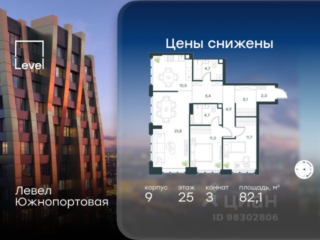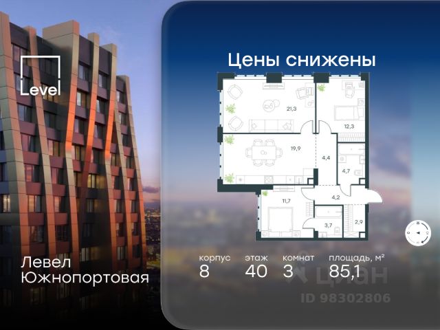 Цена указана с учётом скидки при 100%-й оплате, несубсидированной ипотеке, рассрочке (кроме программы "Рассрочка 0%"). В северной части района Печатники продается 3-комнатная квартира площадью 86.00 кв.м без отделки. Квартира расположена на 3 этаже 49-этажного корпуса 8 в жилом комплексе комфорт-класса Левел Южнопортовая (компания Level Group/Левел групп). Отличная транспортная доступность: - 10 мин. пешком до станции метро "Кожуховская"; - 20 мин. пешком до станции МЦК "Дубровка"; - 3 мин. на авто до ТТК; - 13 мин. на авто до Садового кольца; - 15 мин. на авто до Бульварного кольца. Продуманный архитектурный проект: - авторская архитектура от бюро СПИЧ; - уникальные виды на реку, парки и достопримечательности города; - высота потолков в квартирах до 6 м; - окна высотой до 1,87 м с высоким коэффициентом сопротивления теплоотдаче. Расположение: Жилой комплекс Левел Южнопортовая строится в северной части района Печатники - самой приближенной к центру. Здесь будет сформирован новый район "Южный порт", где построят крупный жилой и общественно-деловой центр, аналогичный Москва-Сити. В течение 10-12 лет в этом месте появятся не только жилые дома, но и развитая инфраструктура для жизни и работы. А еще совсем рядом находится набережная Москвы-реки, где планируется построить причалы для речных трамвайчиков и канатную дорогу. Уже сейчас вокруг жилого комплекса работают десятки магазинов и торговых центров, рядом расположено 6 парков, среди которых музей-заповедник "Коломенское". В 10 минутах пешком - 2 муниципальных и 2 частных детских сада, 7 общеобразовательных школ. Внутренняя инфраструктура: Для отдыха жителей в каждом корпусе предусмотрено лобби, оснащенное местами для отдыха, гостевыми санузлами и лапомойками, а в отдельных корпусах - камином. За счёт больших окон и высоких потолков пространства будут наполнены воздухом и светом. На первых этажах жилого комплекса откроются магазины, салоны красоты, фитнес-центр. Для детей строятся собственные детский сад и школа. Благоустройство: Внутренний двор комплекса разработан совместно с бюро GAFA. Основная идея - создать аналог Центрального парка в Нью-Йорке, гармонично сочетая высотные здания и большое изолированное парковое пространство. Вся площадь двора-парка будет огорожена и составит более 2 га, из которых 45% - озеленение. Одним из самых важных ландшафтных элементов здесь станет небольшая речка, наполняющаяся во время дождя. Вокруг неё появится сеть из островов, внутри которых расположатся тематические зоны спорта и отдыха. Технологии и инженерия: - автоматическая передача в управляющую компанию показаний квартирных счётчиков; - телефонная связь, телевидение и интернет на базе оптической мультисервисной сети; - гостевой вайфай в лобби и на территории двора; - единый ключ доступа для входа на территорию комплекса.