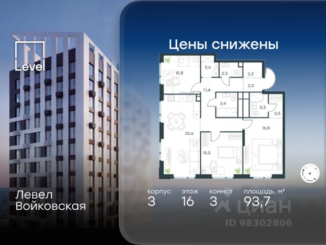 Цена указана с учётом скидки при 100%-й оплате, несубсидированной ипотеке, рассрочке (кроме программы "Рассрочка 0%"). Продается 3-комнатная квартира площадью 89.90 кв. м с отделкой. Квартира находится на 14 этаже 26-этажного корпуса 4, в новом жилом комплексе бизнес-класса Левел Войковская, расположенном рядом с живописным заповедником "Покровское-Стрешнево" (застройщик - компания Level Group/Левел групп). Прекрасная транспортная доступность - 7 мин. пешком до станции МЦК "Балтийская"; - 15 мин. пешком до станции метро "Войковская"; - 8 мин. на машине до ТТК; - 15 мин. на машине до центра Москвы; - 20 мин. на машине до Москва-Сити. Продуманный архитектурный проект - стильная архитектура от мастерской Фефелова В. В.; - панорамные виды на парки, Химкинское водохранилище и Останкинскую башню; - лобби с высотой потолков до 6,45 метров; - более 20 видов планировок, включая редкие форматы квартир с террасой и увеличенной высотой потолков до 5,42 метров; - 2 варианта дизайнерской отделки в корпусе 4 как дополнительная опция к предчистовой отделке: стиль Модерн в светлых холодных тонах и стиль Классик в нейтральной бежевой гамме. Квартиры в корпусах 3 и 5 сдаются без отделки. Расположение Жилой комплекс Левел Войковская строится в престижном Северном округе Москвы, где развитая инфраструктура и живописная природа переплетаются в единый ансамбль. Войковский район окружают парки и набережные. В шаговой доступности - парк "Покровское-Стрешнево", не более 15-ти минут на велосипеде занимает путь до Тимирязевского парка и 9-ти минут до парка усадьбы Михалково. Рядом более 60 школ, 75 дошкольных учреждений, 17 государственных и 6 частных вузов, 25 супермаркетов, 4 торговых центра, среди которых ТЦ "Метрополис" и ТЦ "Авиапарк". Внутренняя инфраструктура На территории жилого комплекса предусмотрены коммерческие помещения: кафе, ресторан, пекарня и другие сервисы на первых этажах корпусов. Для жителей будет доступен отапливаемый подземный паркинг на 244 машино-места с доступом с любого этажа на лифте. На территории паркинга будет расположено 125 кладовых помещений для хранения сезонного инвентаря. Лобби и благоустройство Дизайн лобби жилого комплекса Левел Войковская создан совместно с бюро "Бланк Архитектс" (Blank Architects). Теплая цветовая гамма, ресепшен, зоны ожидания, лапомойки и гостевые санузлы - каждая деталь превращает лобби в комфортное продолжение вашего дома. 1,15 га площади в первых двух этапах строительства отведено под приватный внутренний двор, который спроектирован совместно с бюро "Правда". Детские площадки для всех возрастов, спортивные пространства для йоги, уличных тренировок и петанка, уютные зоны для тихого отдыха или работы. Здесь утро начинается с вдохновения, а вечер наполнен приятными моментами. Лифты Комфортное перемещение внутри жилого комплекса обеспечат надёжные лифты с доступом в паркинг с жилых этажей. В каждом корпусе предусмотрено по 3 грузопассажирских лифта.