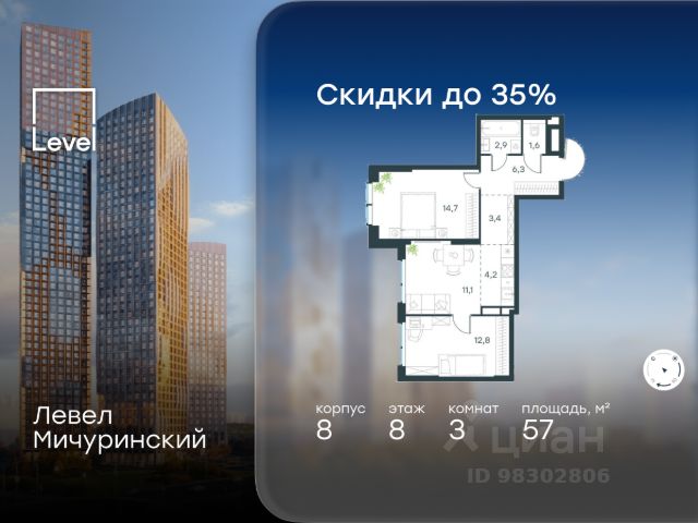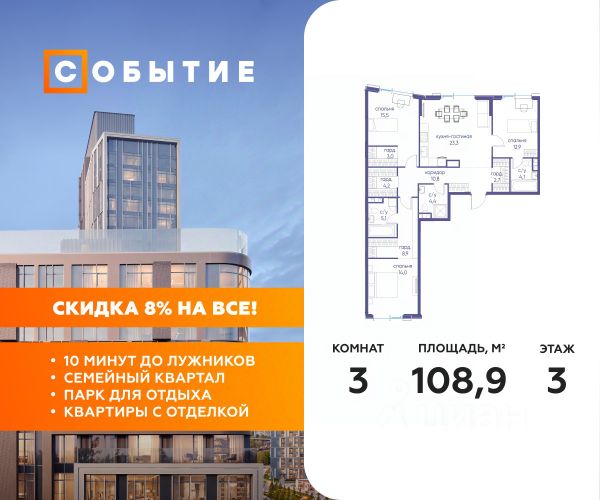 Весь март - скидка до 8% действует до 31.03.2026 г. при 100% оплате и не субсидированной ипотеке! В продаже 3-к квартира от застройщика. Общая площадь 76.00, жилая 37.00, кухня 20.9. Квартира расположена на 7 этаже жилого квартала "Событие-6", корпус 2, Секция 4. Квартира без отделки. Срок сдачи: 4 кв. 2029 года. СОБЫТИЕ.6 — финальный дом парк-квартала СОБЫТИЕ на Мосфильмовской. Переезжайте в уже сформированный квартал с готовой инфраструктурой и парком! Премиальный жилой комплекс в престижном районе Москвы предлагает стильную архитектуру, продуманное благоустройство и великолепно разнообразие общественных пространств. Свой парк прямо возле дома! Архитектура Архитектура СОБЫТИЯ.6 выполнена в ультрасовременном стиле московским бюро Atrium на основе дизайн-кода британских архитекторов LDA Design и UHA London. Дом отличает оригинальная геометрия фасадов, большое остекление и высокие лобби (до 6,2 м) с авторской мебелью и светильниками. Расположение Мосфильмовская улица (Раменки) — один из престижных районов Москвы. Близость к историческому и деловому центру, природным зонам Запада столицы. Транспортная доступность: • 10 мин до Москва-Сити и ТТК; • 15 мин до Садового кольца; • 25 мин до аэропорта Внуково; • 7-10 мин до станций метро "Аминьевская" и "Мичуринский проспект". Инфраструктура: • парк "Событие" (12 га, финалист конкурса Правительства Москвы) с беговыми (1,5 км) и велодорожками (2,7 км), экотропой (1,6 км), площадками, лекторием; • школа, детский сад, магазины, салоны красоты, рестораны (к моменту заселения); • мультидвор с игровыми и спортивными площадками, мини-бульваром; • общественная терраса на 10-м этаже (коворкинг, лаунж); • Закрытые общественные пространства: детская комната, спортивный зал, коворкинг, лаунж-зоны. Паркинг 256 мест для жителей (48 — для электромобилей), 24 гостевых (5 — для электромобилей), мойки колес, кладовые, зоны для велосипедов. Окружение Парки и заповедники (Воробьёвы горы, Матвеевский лес и др.), МГУ, театр им. Н. И. Сац, стадион "Лужники". Безопасность Видеонаблюдение, контроль доступа, видеодомофоны, консьерж-сервис 24/7, системы пожарной безопасности и мультисервисная оптическая сеть.