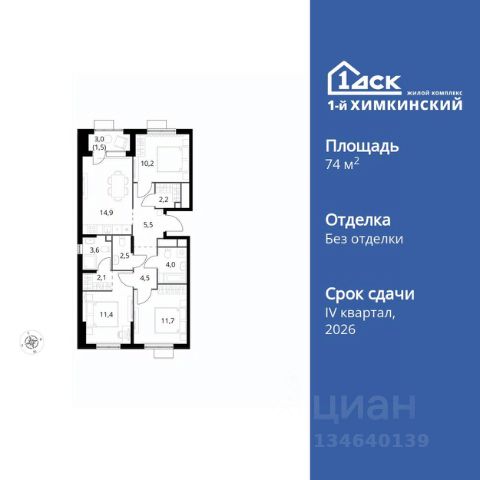 УСПЕЙ ПО СЕМЕЙНОЙ ИПОТЕКЕ БЕЗ НАЦЕНКИ! От 25 000 рублей в месяц! Прямая продажа от застройщика! Жилой Комплекс класса Комфорт. Продаётся 3-к квартира номер 96 общей площадью 74.1 кв.м. на 14-м этаже 17 этажного здания. Без отделки. Особенности квартиры: - Мастер-зона с санузлом и гардеробной. Всё для вашего комфорта и удобства, включая личный санузел и гардероб. - Распашная планировка - отличное сочетание удобства и свободы. - Окно в ванной - натуральное освещение для уюта и комфорта. - Душ помимо ванной - дополнительное удобство для вашей семьи. - Просторная кухня - место для семейных ужинов и кулинарных экспериментов. - Гардеробная - удобство для хранения и организации вещей. - Лоджия - уютное место для отдыха и тишины. Информация о комплексе: Квартал класса комфорт плюс, где современное городское пространство граничит с удивительной природой вокруг. 1-й Химкинский расположен на территории в 102 га и органично вписан в природное окружение Химкинского леса и канала им. Москвы. В проекте предусмотрена богатая коммерческая инфраструктура с собственным торговым центром, общеобразовательные учреждения и социальные объекты. Изюминкой жилого комплекса будут спортивно-оздоровительный комплекс с термами и SPA и семейный парк развлечений. Транспортная доступность: ЖК "1-й Химкинский" дает возможность выбрать любой способ передвижения как до города, так и до самых разных объектов, которые могут представлять интерес для его жителей. Не важно, какой способ передвижения вы предпочитаете, успевать всегда и везде можно вне зависимости от выбора транспорта. - 8 мин. пешком (800 м) до остановки "Золотая Арка" -10 мин пешком (1 км) до остановки "Поворот на Ивакино" Внутренняя инфраструктура: - Безопасность: закрытые дворы без машин, безбарьерная среда и сквозные подъезды, камеры на детских площадках с возможностью трансляции на смартфоне - Идеальный отдых в кругу семьи: семейный парк развлечений на территории, торговый центр (2-х этажный) общей площадью более 8 тыс. кв. м с фудкортом - Образование: 3 детских сада и современная муниципальная школа на 2450 мест - Спортивная среда: закольцованный веломаршрут с навигацией, спортивный комплекс с термами, закрытый тренажерный зал и зоны ворк-аута - Социальные объекты: поликлиника со станцией скорой помощи, пожарное депо - Подземный паркинг и кладовые помещения на -1 этаже, станция техобслуживания и автомойка на территории