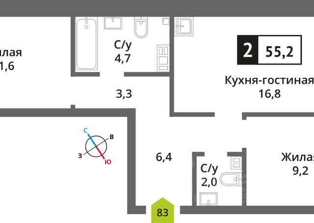 - Планировка: Объединенная зона кухни и гостиной Две отдельные спальни, Гардеробная 13 м2, два санузла.