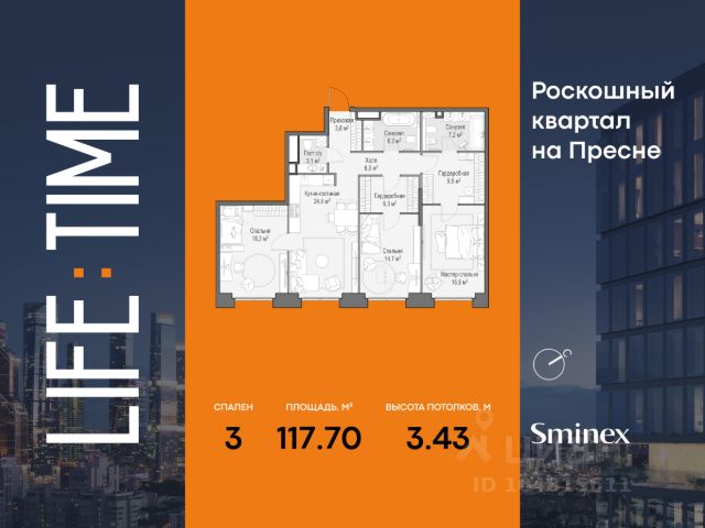 Просторная светлая квартира площадью 119,3 кв. м с окнами, выходящими на тихую улицу Сергея Макеева и современный бизнес-центр Marr Plaza. Большое панорамное окно в с/у с возможностью открывания настежь улучшает видовые характеристики. Продуманная планировка позволяет разместить две мастер-спальни с отдельными санузлами и гардеробными и одной просторной спальней. Life Time - роскошный современный квартал на Пресне, в наиболее быстро растущем премиальном районе ЦАО. Его насыщенная инфраструктура и выгодное расположение дарят время для жизни. Вы больше не тратите его на дорогу или ожидание, при этом ни в чём себе не отказывая. На территории предусмотрено всё для комфортной жизни: • двор-парк площадью 1,8 гектара с прудом и фонтанами; • Clubhouse - инфраструктурный центр в отдельном здании с исчерпывающими возможностями для спорта, отдыха и досуга только для жителей; • спортивная инфраструктура на улице и в помещении, в том числе бассейн длиной 25 метров, хот-таб, хаммам, сауна, бьюти-зона; • клубная гостиная с террасой; • всё для развития и досуга детей любого возраста, в том числе детский сад и школа. Life Time находится в центре сложившегося премиального района, в окружении многочисленных парков. Удобная транспортная доступность и прямой выезд на Звенигородское шоссе позволяют без проблем добраться до Садового кольца и Москва-Сити. Архитектурный стиль квартала - роскошный минимализм. Дома десятилетиями будут выглядеть современно.
