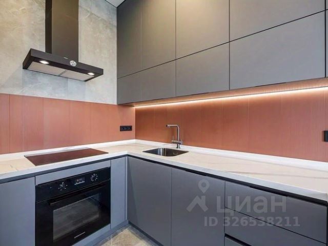 Кухня-гостиная: современная встраиваемая кухня с качественной фурнитурой, холодильник, посудомоечная машина, индукционная панель, духовой шкаф с микроволновкой, мощная вытяжка, диван, стол и стулья, зона TV