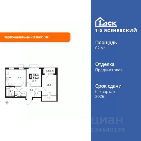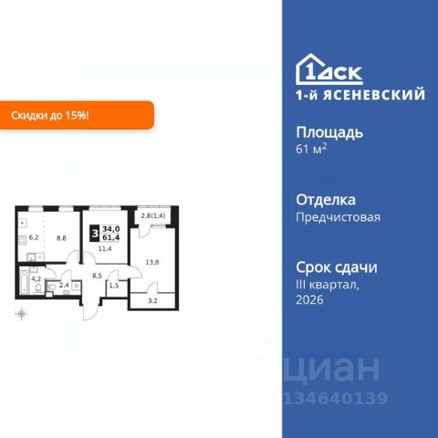 Прямая продажа от застройщика! Жилой Комплекс класса Комфорт Плюс. Продаётся 3-к квартира номер 672 общей площадью 62.2 кв.м. на 8-м этаже 18 этажного здания. Отделка Whitebox. Цена с учётом скидки. Особенности квартиры: - Квартиры рядом с метро - м. Корниловская 9 мин пешком - 63 га лесопарка за окнами - Школа c it-кластером и бассейном. 2 детских сада - Мастер-зона с гардеробной. Просторное место для отдыха и удобного хранения вещей. - Линейная планировка - максимальная функциональность и удобство. - Увеличенная ширина окна/окон - больше света и визуального простора. - Увеличенное количество окон - дополнительное освещение и свежий воздух. - Гостевой санузел - комфорт и удобство для ваших гостей. - Евроформат - просторное и удобное жилье с отличной планировкой. - Можно оборудовать 2 или более рабочих места - пространство для нескольких человек. - Возможность добавить спальное место - дополнительный комфорт для гостей. - Гардеробная - удобство для хранения и организации вещей. - Лоджия - уютное место для отдыха и тишины. Квартира с предчистовой отделкой (White box). Вам не придется заниматься черновыми и трудоёмкими работы, а чистовую отделку и дизайн - сделайте на свой вкус. Информация о комплексе: В жилом комплексе комфорт-плюс класса "1-го Ясеневского" доступны преимущества двух стилей жизни. Ведь в пешей доступности метро, школа с 25-метровым бассейном и IT-кластером и при этом целых 63 га благоустроенного Троицкого лесопарка под окнами, где так приятно дышать свежим воздухом и слушать пение птиц. Собственная закрытая территория "1-го Ясеневского" представляет собой уютный оазис. Здесь и зеленый освещенный бульвар для прогулок, система велодорожек, маленькая городская площадь, кафе, пекарни и кофе поинты. А еще дворы без машин и многоэтажная парковка. Изюминка территории - фруктовые деревья во дворах и городские сады. "1-й Ясеневский" - всего в 1 км от МКАД, на территории новой Москвы. Жилой комплекс, где есть все необходимое для современного человека. Транспортная доступность: До метро "Корниловская" - 12 минут пешком До метро "Тютчевская" - 25 минут пешком До метро "Теплый стан" - 10 минут на транспорте До метро "Ольховая" - 30 минут на общественном транспорте Личный автотранспорт: Выезд на Калужское шоссе - 500 м МКАД - 1 км Внутренняя инфраструктура: ЖК "1-й Ясеневский" можно назвать идеальным местом для жизни семьи с детьми. Здесь буквально за домом находится Троицкий лесопарк - излюбленное место прогулок молодых родителей. А во внутренних дворах под детские площадки выделены специальные зоны. Они оборудованы всем, что нужно для счастливого детства: современными и максимально безопасными качелями, песочницами и лазалками. Оборудование и игровые сценарии на детских площадках спроектированы вместе с командой детских психологов для правильного развития ребенка и для повышения их интереса. Также рядом с домом два детских садика, один из которых уже построен и школа на 1100 мест. Школу по пр