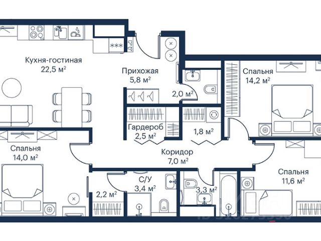Монолитный 20-ти этажный дом бизнес-класса построен по индивидуальному проекту в 2023 году. Общая площадь квартиры - 90,5 кв.м. 3 спальни: 14/14/12 кв.м., 3 сан. узла, 2 гардеробных. Кухня-гостиная 22,5 кв.м. Высокий потолок 2,85 м. Всего 3 квартиры на этаже.