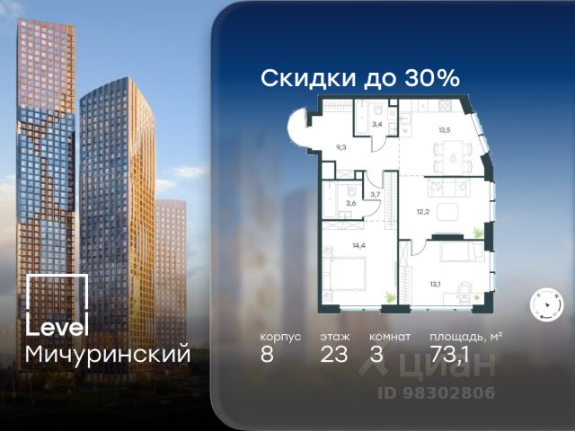 Цена указана с учётом скидки при 100%-й оплате, несубсидированной ипотеке, рассрочке (кроме программы "Рассрочка 0%"). В жилом квартале, расположенном на границе с природным заказником "Долина реки Очаковки", продаётся 3-комнатная квартира площадью 56.00 кв.м без отделки. Квартира расположена на 37 этаже 48-этажного корпуса 8 в жилом комплексе бизнес-класса Level Мичуринский (компания Level Group/Левел групп). Отличная транспортная доступность: - от 10 мин. пешком до станции метро "Мичуринский проспект" - 15 мин. пешком до станции метро "Аминьевская" - 7 мин. на авто до МКАД - 10 мин. на авто до ТТК - 15 мин. на авто до Москва-Сити Продуманный архитектурный проект: - Выразительная архитектура от известных бюро: корпуса 1-6 - СПИЧ, корпуса 7-13 - Borisov Architects; - Из окон открываются живописные виды на парки, Москва-Сити и МГУ; - Высокие потолки до 6,35 м; - Стильные лобби с окнами в пол и высокими потолками до 4,7 м; - С каждого этажа дома на лифте можно спуститься в подземный отапливаемый паркинг. Расположение: Level Мичуринский строится в одном из самых зелёных районов Москвы - Очаково-Матвеевское. Этот уголок столицы идеален для поддержания здорового образа жизни. В шаговой доступности от проекта находятся заказник "Долина реки Очаковки" - 1 мин. пешком и Очаковский парк - 7 мин. пешком. На велосипеде можно добраться до таких парков, как "Событие", парк Олимпийской деревни, парк 50-летия Октября и парк Школьников. В 15 минутах езды на авто расположено более 30 детских садов (из них 14 в пешей доступности), 32 школы (из них 13 в пешей доступности) и 14 вузов. Также в ближайшем окружении - более 25 медицинских учреждений, 11 спортивных клубов и 22 продуктовых супермаркета. Внутренняя инфраструктура: На территории жилого комплекса строится три детских сада и школа. На первых этажах домов откроется супермаркет, фитнес-центр, ресторан, кафе и другие сервисы. Подземные этажи займут паркинги: трёхуровневые - в этапах 1 и 2, одноуровневый - в этапах 3 и 4. Преимущества проекта: - 4,5 га благоустроенной территории с видовым мостом, уличным кинотеатром, зонами для тихого отдыха, работы, воркаута, площадки для петанка, футбола, настольного тенниса и пляжного волейбола. - Дизайнерские лобби с панорамным видом на двор, мойками для лап животных и комфортными зонами ожидания. - Безопасность жителей: круглосуточное видеонаблюдение всех зон общего пользования (лобби, лифты, паркинги, детские площадки), система контроля доступа, управление видеодомофоном через мобильное приложение, единый ключ доступа на территорию жилого комплекса. - Технологии и комфорт: высокоскоростной Wi-Fi в лобби и на придомовой территории, автоматическая система контроля и учёта ресурсов, абонентская связь с консьержем, распознавание номеров автомобилей при въезде в паркинг и выезде из него.