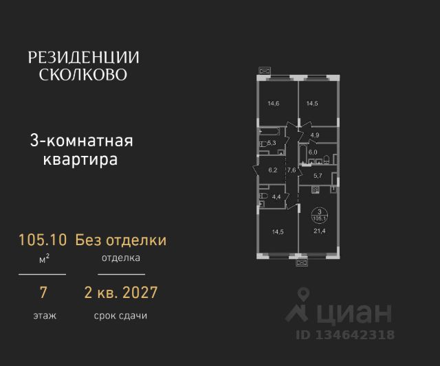 Продается трехкомнатная квартира в девятиэтажном монолитном доме жилого комплекса "Резиденции Сколково". Общая площадь квартиры - 102,4 кв. м, этаж 4 из 9. Срок сдачи - 2 квартал 2027 года. Резиденция 2.2 состоит из 6 секций: - 5 секция с отделкой White Box с возможностью повышения до дизайнерской за дополнительную плату - Остальные секции - без отделки ЖК "Резиденции Сколково" - это современный проект бизнес-класса, расположенный в престижном районе Сколково, у западной границы Москвы. ТРАНСПОРТНАЯ ДОСТУПНОСТЬ: - 0 км от МКАД - 10 минут на личном авто до метро "Озёрная" Солнцевской линии - 15 минут на личном авто до Москва-Сити по Кутузовскому проспекту - 20 минут на личном авто до центра по проспекту Генерала Дорохова - 24 минут на личном авто до центра по Мичуринскому проспекту ОСОБЕННОСТИ РЕЗИДЕНЦИИ 2.2: - панорамное остекление - французские балконы - сквозные входные группы с безбарьерным входом - стильная мягкая зона ожидания - колясочные во входных группах на 1 этажах - входная группа 1 этажа каждой секции оснащена санузлом - паркинг на -1 этажах - по 2 лифта: 1 пассажирский, 1 грузопассажирский ПРИВАТНОСТЬ: Огороженная, закрытая территория, круглосуточное видеонаблюдение, контроль доступа во внутренний двор. БЛАГОУСТРОЙСТВО И ИНФРАСТРУКТУРА: Масштабное озеленение в концепции "двора-парка" и множество площадок отдыха для взрослых и детей. В 5 минутах ходьбы расположен Мещерский лесопарк. В жилом комплексе уже построены и работают 2 муниципальных детских сада с бассейном, школа на этапе строительства. В непосредственной близости - частные и муниципальные детские сады и школы, кафе и рестораны, продуктовые магазины, салоны красоты и другие готовые объекты городской инфраструктуры. *В 3D туре представлена отделка "Фрунзуская классика. Business Plus"