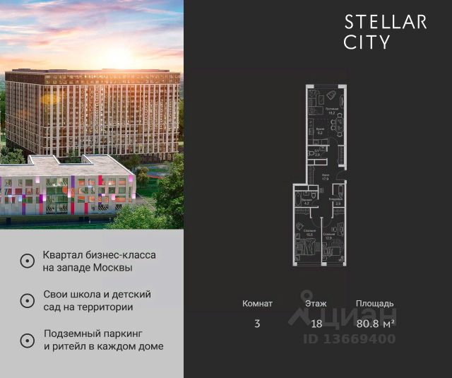 Продается квартира от надежного застройщика Tashir Estate в квартале бизнес-класса Stellar City в ЗАО Москвы. Площадь квартиры составляет: 71.7 кв. м, потолки: 3.1 м Квартира находится на 4 этаже, 4 корпуса жилого квартала Stellar City — микрогорода будущего на орбите Москвы. Stellar City — квартал в ЗАО Москвы вблизи инновационного центра Сколково. В окружении — 11 парков и природных зон, в том числе Долина реки Сетунь, Мещерский лес и парк развлечений The Rink. Город в городе Чтобы дом и инфраструктура вокруг отвечала динамичному лайфстайлу жителя мегаполиса, в основу проекта легла концепция город в городе, которая позволяет решать все бытовые вопросы in-home. В квартале будут возведены школа и детский сад, воркаут-зоны, променад, вело и беговые дорожки, детские площадки для каждого корпуса, а также коммерция на первых этажах для ежедневных покупок. Все необходимое — на расстоянии нескольких шагов. Изящные и лаконичные лобби Авторский дизайн, натуральные материалы в отделке и безупречный интерьер вне времени. Лобби и холлы в проекте бизнес-класса Stellar City ничем не отличаются от входных групп в премиум-сегменте благодаря качественным европейским материалам в отделке, стильному дизайну, консьерж-сервису и уютной зоне ожидания с журнальными столиками и мягкой мебелью. Комфорт и безопасность Закрытая территория, охрана, система СКУД, специально разработанное мобильное приложение дома для резидентов и подземный паркинг с круглосуточным наблюдением и доступом с помощью автоматического считывания номера авто.