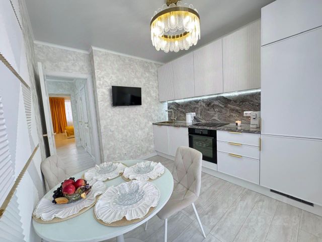 В квартире выполнен евро-ремонт - качественные отделочные материалы, правильные формы комнат, однотонные цветовые решения, встроенные потолочные светильники, люстры и многослойный оконный текстиль прекрасно сочетаются с нежными цветовыми решениями.
