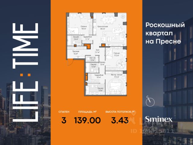 Уникальная квартира общей площадью 215,9 кв. м с личной террасой (40,1 кв. м), высота потолка которой достигает 10 метров. Терраса - отличное место для лаундж-пространства, где вы можете наслаждаться атмосферой загородного дома в самом центре Москвы. Панорамные окна и высокие 3,5-метровые потолки создают изысканное пространство, наполненное светом. Мастер-спальня станет вашим любимым местом в квартире, окна в гардеробной и ванной комнате превратят привычные процедуры в настоящий ритуал. Продуманное планировочное решение позволяет разместить три спальные комнаты с гардеробными и отдельными санузлами. А просторная кухня-гостиная (48,2 кв. м) станет точкой притяжения всей семьи, позволяя наслаждаться лучшими закатами Пресненского района. Life Time - роскошный современный квартал на Пресне, в наиболее быстро растущем премиальном районе ЦАО. Его насыщенная инфраструктура и выгодное расположение дарят время для жизни. Вы больше не тратите его на дорогу или ожидание, при этом ни в чём себе не отказывая. На территории предусмотрено всё для комфортной жизни: • двор-парк площадью 1,8 гектара с прудом и фонтанами; • Clubhouse - инфраструктурный центр в отдельном здании с исчерпывающими возможностями для спорта, отдыха и досуга только для жителей; • спортивная инфраструктура на улице и в помещении, в том числе бассейн длиной 25 метров, хот-таб, хаммам, сауна, бьюти-зона; • клубная гостиная с террасой; • всё для развития и досуга детей любого возраста, в том числе детский сад и школа. Life Time находится в центре сложившегося премиального района, в окружении многочисленных парков. Удобная транспортная доступность и прямой выезд на Звенигородское шоссе позволяют без проблем добраться до Садового кольца и Москва-Сити. Архитектурный стиль квартала - роскошный минимализм. Дома десятилетиями будут выглядеть современно.
