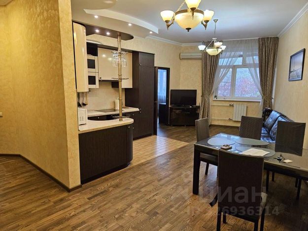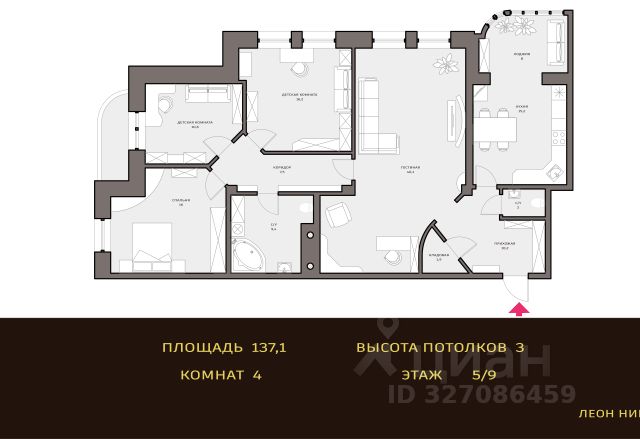 В квартире: холл 6 м2 с зеркальным шкафом; зал 30 м2 ; две спальни - 14,8 м2 и 17 м2 ; кухня с панорамными окнами 19,5 м2 ; два полноценных сан/узла - 4,2 и 6,7 м2 ; гардеробная 9 м2 ; балкон 8,5 м2. Высота потолков в квартире 3 м.