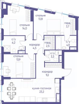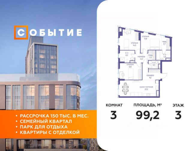 В продаже 3-к квартира от застройщика. Общая площадь 82.00, жилая 44.20, кухня 23.9. Квартира расположена на 7 этаже жилого квартала "Событие-6", корпус 1, Секция 3. Квартира с чистовой отделкой. Срок сдачи: 4 кв. 2029 года. СОБЫТИЕ.6 — финальный дом парк-квартала СОБЫТИЕ на Мосфильмовской. Переезжайте в уже сформированный квартал с готовой инфраструктурой и парком! Премиальный жилой комплекс в престижном районе Москвы предлагает стильную архитектуру, продуманное благоустройство и великолепно разнообразие общественных пространств. Свой парк прямо возле дома! Архитектура Архитектура СОБЫТИЯ.6 выполнена в ультрасовременном стиле московским бюро Atrium на основе дизайн-кода британских архитекторов LDA Design и UHA London. Дом отличает оригинальная геометрия фасадов, большое остекление и высокие лобби (до 6,2 м) с авторской мебелью и светильниками. Расположение Мосфильмовская улица (Раменки) — один из престижных районов Москвы. Близость к историческому и деловому центру, природным зонам Запада столицы. Транспортная доступность: • 10 мин до Москва-Сити и ТТК; • 15 мин до Садового кольца; • 25 мин до аэропорта Внуково; • 7-10 мин до станций метро "Аминьевская" и "Мичуринский проспект". Инфраструктура: • парк "Событие" (12 га, финалист конкурса Правительства Москвы) с беговыми (1,5 км) и велодорожками (2,7 км), экотропой (1,6 км), площадками, лекторием; • школа, детский сад, магазины, салоны красоты, рестораны (к моменту заселения); • мультидвор с игровыми и спортивными площадками, мини-бульваром; • общественная терраса на 10-м этаже (коворкинг, лаунж); • Закрытые общественные пространства: детская комната, спортивный зал, коворкинг, лаунж-зоны. Паркинг 256 мест для жителей (48 — для электромобилей), 24 гостевых (5 — для электромобилей), мойки колес, кладовые, зоны для велосипедов. Окружение Парки и заповедники (Воробьёвы горы, Матвеевский лес и др.), МГУ, театр им. Н. И. Сац, стадион "Лужники". Безопасность Видеонаблюдение, контроль доступа, видеодомофоны, консьерж-сервис 24/7, системы пожарной безопасности и мультисервисная оптическая сеть.