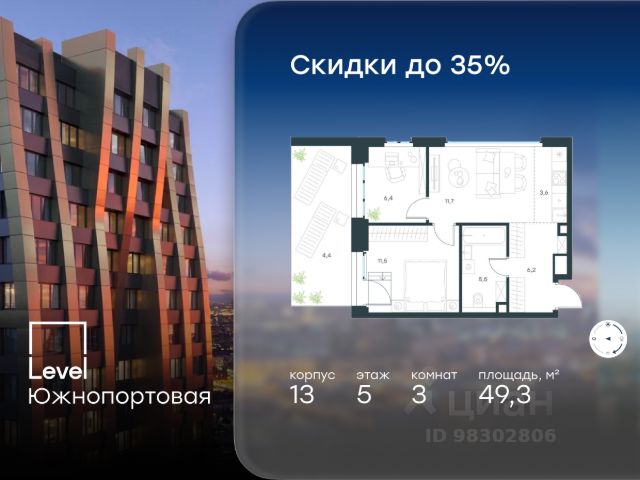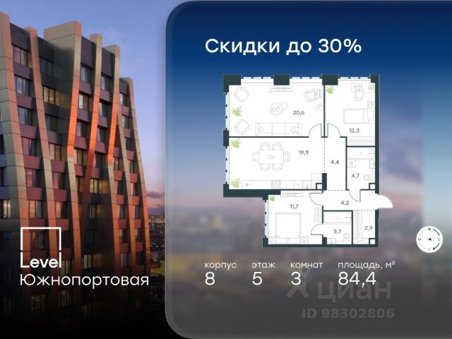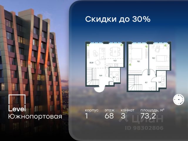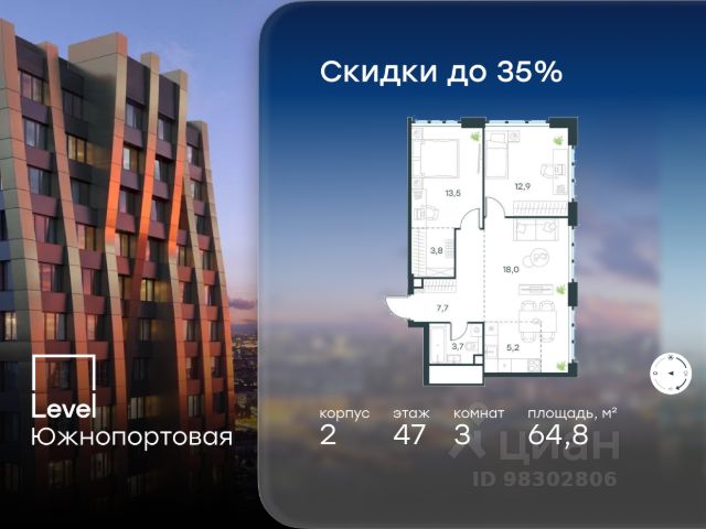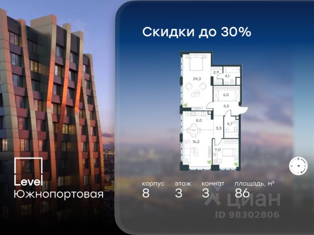 Цена указана с учётом скидки при 100%-й оплате, несубсидированной ипотеке, рассрочке (кроме программы "Рассрочка 0%"). В северной части района Печатники продается 3-комнатная квартира площадью 55.80 кв.м без отделки. Квартира расположена на 67 этаже 68-этажного корпуса 3 в жилом комплексе комфорт-класса Level Южнопортовая (компания Level Group/Левел групп). Отличная транспортная доступность: - 10 мин. пешком до станции метро "Кожуховская"; - 20 мин. пешком до станции МЦК "Дубровка"; - 3 мин. на авто до ТТК; - 13 мин. на авто до Садового кольца; - 15 мин. на авто до Бульварного кольца. Продуманный архитектурный проект: - авторская архитектура от бюро СПИЧ; - уникальные виды на реку, парки и достопримечательности города; - высота потолков в квартирах до 6 м; - окна высотой до 1,87 м с высоким коэффициентом сопротивления теплоотдаче. Расположение: Level Южнопортовая строится в северной части района Печатники - самой приближенной к центру. Здесь будет сформирован новый район "Южный порт", где построят крупный жилой и общественно-деловой центр, аналогичный Москва-Сити. В течение 10-12 лет в этом месте появятся не только жилые дома, но и развитая инфраструктура для жизни и работы. А еще совсем рядом находится набережная Москвы-реки, где планируется построить причалы для речных трамвайчиков и канатную дорогу. Уже сейчас вокруг жилого комплекса работают десятки магазинов и торговых центров, рядом расположено 6 парков, среди которых музей-заповедник "Коломенское". В 10 минутах пешком - 2 муниципальных и 2 частных детских сада, 7 общеобразовательных школ. Внутренняя инфраструктура: Для отдыха жителей в каждом корпусе предусмотрено лобби, оснащенное местами для отдыха, гостевыми санузлами и лапомойками, а в отдельных корпусах - камином. За счёт больших окон и высоких потолков пространства будут наполнены воздухом и светом. На первых этажах жилого комплекса откроются магазины, салоны красоты, фитнес-центр. Для детей строятся собственные детский сад и школа. Благоустройство: Внутренний двор комплекса разработан совместно с бюро GAFA. Основная идея - создать аналог Центрального парка в Нью-Йорке, гармонично сочетая высотные здания и большое изолированное парковое пространство. Вся площадь двора-парка будет огорожена и составит более 2 га, из которых 45% - озеленение. Одним из самых важных ландшафтных элементов здесь станет небольшая речка, наполняющаяся во время дождя. Вокруг неё появится сеть из островов, внутри которых расположатся тематические зоны спорта и отдыха. Технологии и инженерия: - автоматическая передача в управляющую компанию показаний квартирных счётчиков; - телефонная связь, телевидение и интернет на базе оптической мультисервисной сети; - гостевой Wi-Fi в лобби и на территории двора; - единый ключ доступа для входа на территорию комплекса.