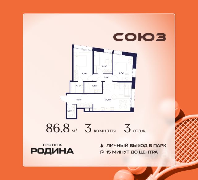 Рассрочка 0% Продаётся 3-комнатная квартира площадью 77.8 м² на 12 этаже в Жилом Комплексе "Союз". Квартал здоровой жизни премиум-класса с рекордным количеством олимпийских видов спорта: - Ледовая арена для хоккея и фигурного катания, - Футбольные поля для тренировок, - Спортивный зал для фехтования, - Бассейн на 6 дорожек, - Центр единоборств, - 4 крытых площадки для настольного тенниса, - 7 теннисных кортов (крытых и открытых), - 4 крытых площадки для сквоша, - Легкоатлетический стадион, - Площадки для баскетбола и волейбола. Уникальные форматы квартир с мастер-спальнями, приватными террасами, балконами, а также пентхаусы с открыточными видами на город. Все квартиры продаются с отделкой Shell&Core и панорамным остеклением. Расположение Пешком: - 2 мин. до парка "Сад Будущего"; - 6 мин. до ст. м. "Ботанический сад"; - 6 мин. до ст. МЦК "Ботанический сад"; - 6 мин. до парка "Леоновская роща"; На автомобиле: - 2 мин. до СВХ (МСД); - 5 мин. до Проспекта Мира; - 10 мин. до ТТК; - 15 мин. до Садового кольца; - 25 мин. до аэропорта "Шереметьево". Благоустройство - собственная спортивная инфраструктура 7 Га; - зона для пикников; - игровые и спортивные площадки для детей всех возрастов; - розарий, а также сосновые, каштановые и дубовые аллеи; - площадки под открытым небом для занятий спортом и йоги; - игровые комнаты для детей; - лаунж-зона для резидентов; - просторная переговорная для деловых встреч; - премиальный ресторан "Шабада" Сосо Павлиашвили с водными арт-объектами на прогулочной аллее, садом ароматных трав и сценой под открытым небом; - кафе, химчистки, аптеки и супермаркеты рядом с домом. Окружение - 8 парков: Сад Будущего, Леоновская роща, Хуамин, Главный ботанический сад РАН, Шереметьевская дубрава, Останкино, парк спорта "Яуза", пойма реки Яуза и музей-усадьба "Останкино"; - 3 ВУЗа: ВГИК, РГСУ, МГПУ; - 12 школ, в том числе: школа 1499 им. И.А. Докукина (топ 100), Brookes Moscow, IThub школа; - 18 детских садов, в том числе билингвальный ALERTUM KIDS; - один из крупнейших океанариумов Европы "Москвариум"; - один из крупнейших в Европе торгово-развлекательных центров "Европолис".