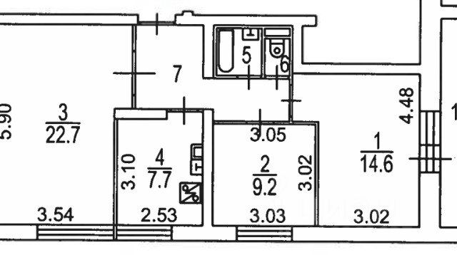 Общая площадь — 62 кв. м, все комнаты изолированные, жилая площадь составляет- 44,1 кв. м, площадь кухни — 6,5 кв. м., высота потолков — 2,5 м. Окна выходят во двор.