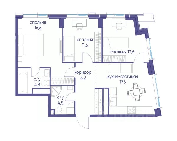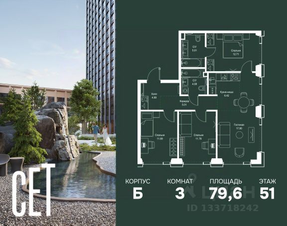 Прямая продажа от застройщика. В ЖК Сет продается 3-комнатная квартира площадью 75.18 м², расположенная в корпусе А, на 28 этаже 52 этажного дома. Сет имеет стратегически выгодное расположение в ЗАО, в районе с большой историей и блестящим будущим: между природной зоной долины реки Сетунь и Кутузовским проспектом. В рамках возведения первой очереди предусмотрено три корпуса высотой 18, 45 и 59 этажей. На верхних этажах спроектированы общедоступные смотровые площадки с панорамным обзором на центр столицы. Преимущества проекта: • Функциональные планировочные решения • Контроль проникновения через входную дверь • Система управления освещением и температурой в квартире • Система защиты от протечек с функцией перекрытия воды • Вход в подъезд по биометрическим считывателям Face ID • Скоростные лифты • Двухуровневый подземный охраняемый паркинг на 495 машино-мест Застройка Сет включает в себя не только жилые корпуса, но и инфраструктурные объекты. Все необходимое для повседневного комфорта будет расположено в шаговой доступности: • Фитнес-Клуб с бассейном • Ведущая городская школа, детский сад и школа искусств • Центр культуры и досуга • Медицинский центр • Кафе и рестораны Расположение комплекса: Пешком: • Метро "Давыдково" - 17 минут • Парк "Долина реки Сетунь" - 3 минуты • Открытие новых станций метро в шаговой доступности в будущем Инфраструктура: Разнообразить свой день резиденты Веер смогут также проводя больше времени на свежем воздухе. Двор разделен на 4 зоны разных эмоций и действий, которые пересечены и соединены веерными прогулочными маршрутами: • Спортивная площадка устроена в глубине "Кленовой рощи" • В "Чайном домике" будет создан навес с утеплением для отдыха в любую погоду • Площадки для детей воплотятся в "Волшебный лес" с цветами, зеркалами и световым дизайном • "Центральная площадь" устроена у водного оазиса живописного пруда. На машине: • "Москва-Сити" - 15 минут • Садовое кольцо - 20 минут • ТЦ "Океания" - 8 минут • ТЦ "Времена года" - 13 минут • Сколково - 12 минут • Гребной канал - 17 минут Компания MR предлагает своим клиентам специальные условия приобретения квартир в рамках программ ипотечного кредитования от банков-партнеров.