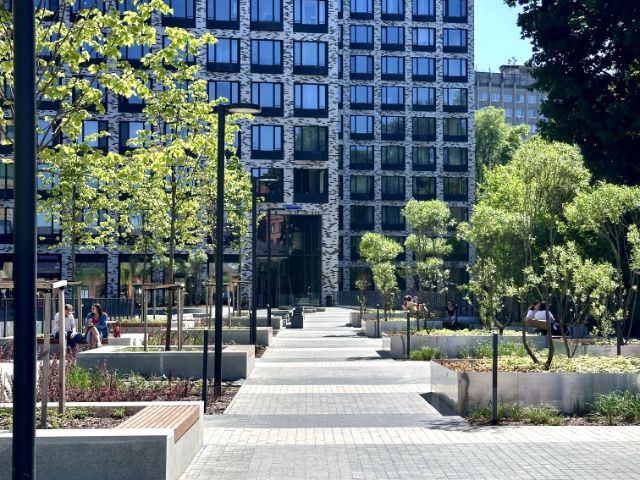 Большой двор-парк, дорожки, клумбы, скамейки, детская и спортивная площадки.