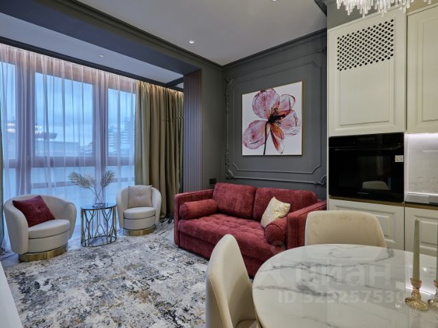 Квартира продается с мягкой мебелью, шкафами и кухней.