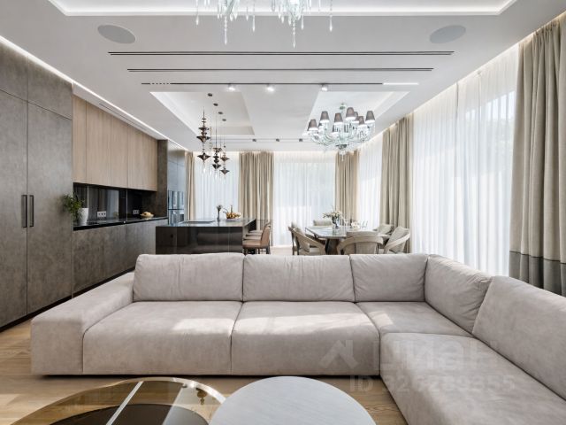 Планировка: кухня-гостиная, 2 спальни, 2 ванных комнаты, гостевой санузел, гардеробная, постирочная, холл.
