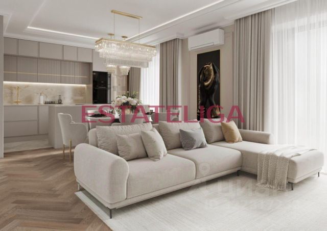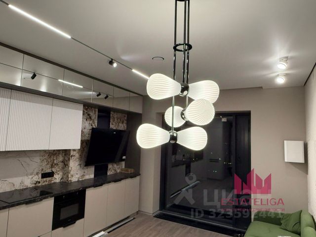 Кухня - гостиная 27.34 м². Кухня выполнена в эмали. Стеклянные верхние шкафы и боковой шкаф. Встроенная техника ( посудомоечная машина, микроволновка, варочная панель и духовой шкаф - фирмы Kuppersberg).