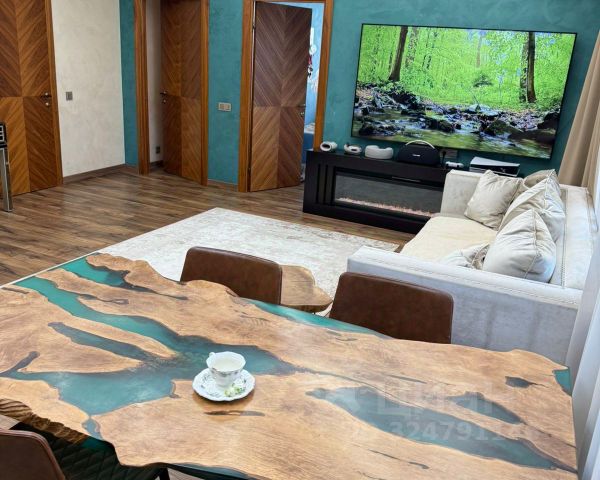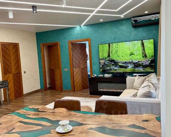 По отделочным материалам , в квартире все стены окрашены венецианской штукатуркой , то есть всегда можно подкрасить а не переклеивать, натяжные потолки с встроенными диодными лентами, когда включаешь все освещение, получается как в детейлинг центре , люстра имеется в кухонной зоне, висит над столом-рекой из слэба карагача с природными краями, залитый эпоксидной смолой, сделан на заказ.
