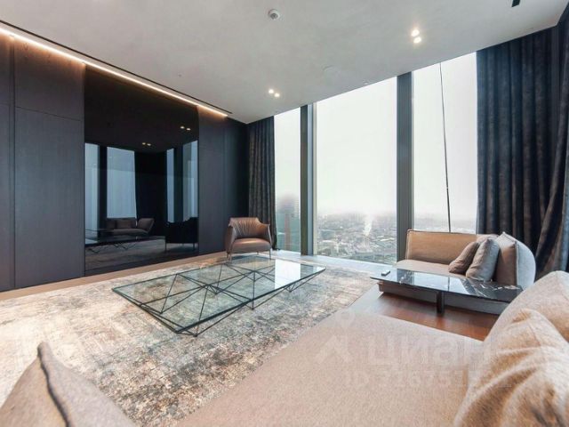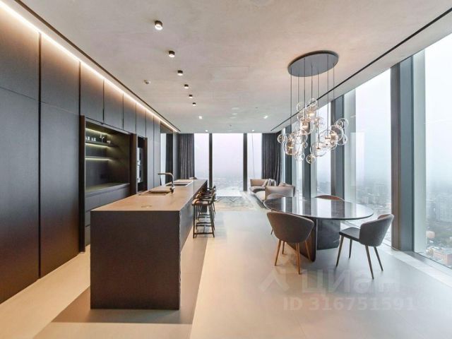 Арочные панорамные окна открывают длинные виды на *Москва-Сити, Саввинскую набережную и Москву-реку* - редкая комбинация направлений для дома Brodsky.
