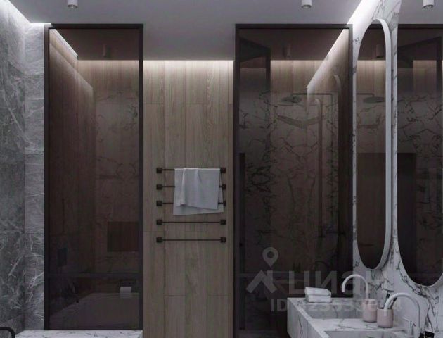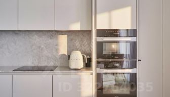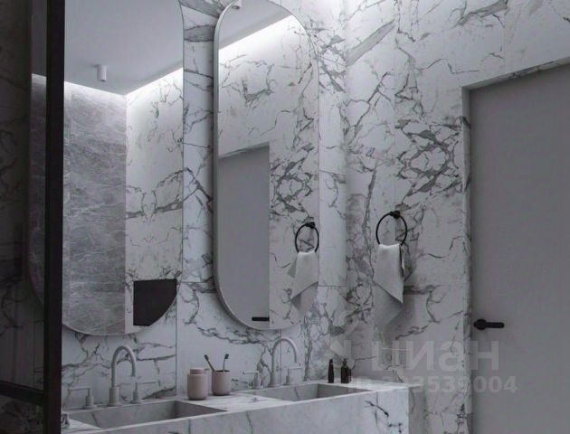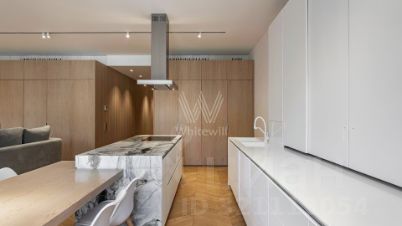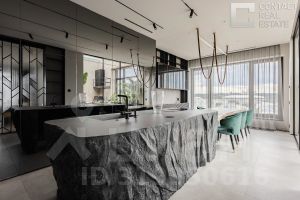 В квартире выполнена премиальная дизайнерская отделка с использованием высококачественных и натуральных материалов, таких как: натуральный мрамор, анодированная бронза, натуральный итальянский шпон, анодированная латунь.