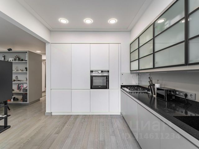 4)кухня 13,1 кв.м., оснащенная кухонным гарнитуром (Италия) с гранитными столешницей и фартуком, холодильником, морозильной камерой, духовым шкафом, электрической варочной панелью, посудомоечной машиной;