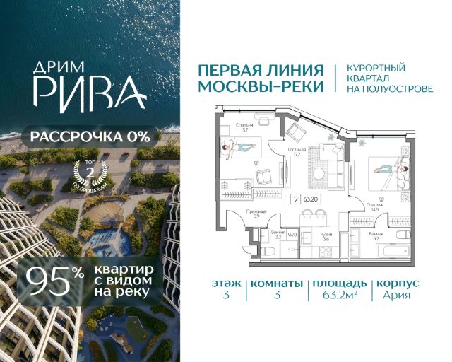 Квартира в премиальном квартале Dream Riva — первая линия Москвы-реки Продается квартира в прибрежном квартале Dream Riva на территории курортной локации "Остров мечты". 63 кв.м, 3 комнат, 3 этаж. Высота потолков 3,1 м. • 95% квартир Жемчужной коллекции смотрят на воду • Мастер-спальня с гардеробной • Естественный свет в гостиной с двух сторон ЛОКАЦИЯ И ТРАНСПОРТ • 15 минут на авто до Садового кольца, • 30 минут до Москва-Сити и Кремля. • 10 минут до метро "Технопарк" в пешей доступности. В перспективе — станция "Остров мечты" (2028г.). ИНФРАСТРУКТУРА КВАРТАЛА • 3 Га приватного двор-парка с зонами для спорта, йоги и отдыха; • Благоустроенная набережная с гастропроменадом; • Клубные лобби с инфраструктурой; • Премиум SPA-центр с бассейном и фитнес-клуб; • Государственный детский сад под окном и школа в 10 минутах от квартала; • Подземный и гостевой паркинг. ПРИВИЛЕГИИ РЕЗИДЕНТОВ • Пляжный клуб Dream Beach Club; • Яхт-клуб Dream Marine Resort; • Вейк-клуб; • Парк развлечений "Остров мечты"; • 44 Га парков для прогулок и спорта в окружении квартала. БЕЗОПАСНОСТЬ И КОМФОРТ • Приватная территория; • Охрана; • Видеонаблюдение; • Консьерж-сервис 24/7; • Современные инженерные системы и технологии умного дома. НАДЕЖНЫЙ ЗАСТРОЙЩИК Regions Development — успешная девелоперская компания. За 20 лет работы реализовали уже более 30 проектов в сегментах коммерческой и многофункциональной недвижимости. Скидки действуют только при 100% оплате и ипотеке Скидки действуют только при 100% оплате, ипотеке и рассрочке. Скидки и акции не суммируются. Звоните, чтобы договориться о просмотре!