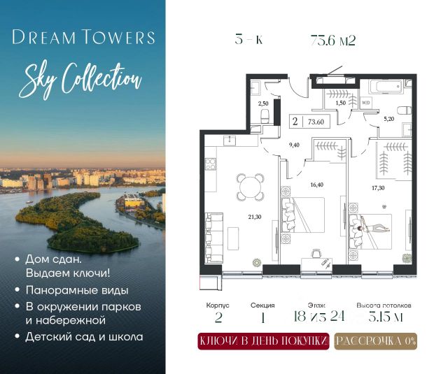 Рассрочка 0% от застройщика. Ключи в день покупки. ЖК Dream Towers — проект премиум-класса в окружении парков и набережной, с полностью готовой инфраструктурой для комфортной жизни и отдыха. Продаётся 3-квартира на 12 этаже 24-этажного дома (1 корпус). Общая площадь: 73.7 кв.м. Высота потолков от 3.15 м. Город-курорт на 100 Га в шаге от вашего дома: • пляжный комплекс Dream Beach Club; • парк аттракционов Остров Мечты; • 44 Га ландшафтных парков; • пешеходная набережная; • яхт-клуб; • Южный речной вокзал; • вейк-парк и многое другое. В Dream Towers предусмотрено все для комфортной жизни с семьей: • дизайнерские лобби с общественной гостиной, колясочной и лапомойками; • охраняемый благоустроенной двор только для жителей; • собственный десткий сад и школа прямо во дворе; • красивая архитектура зданий в стиле Ар-деко; • облицовка фасадов из натурального камня с архитектурной подсветкой; • широкоформатное остекление окон в пол для лучших видовых характеристик на парки и пойму Москвы-реки; • подземный паркинг; • клубный формат проживания; • эргономичные планировки от 40 до 162 м2; • высокие потолки от 3,15 до 4,1 м; • квартиры с террасами; • вся необходимая инфраструктура на первых этажах домов, а также в торговой частия тематического парка "Остров Мечты" (рестораны, кафе, супермаркет, магазины, салон красоты, йога-студия и многое другое). Центр рядом: 15 минут до Садового кольца на авто, 20 минут до Сити или Кремля. В 5 минутах прогулочным шагом — станция метро "Технопарк".