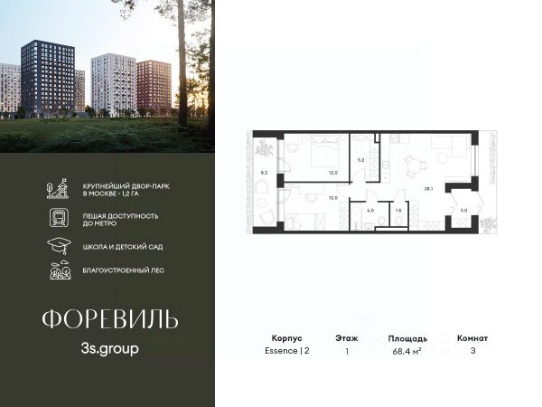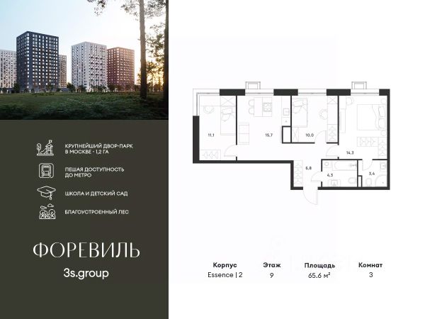 Предчистовая отделка в подарок! Пешая доступность от метро и московская прописка! Продается уютная 3-комн. квартира площадью 65,6 кв.м на 8 этаже 17 этажного жилого комплекса бизнес-класса Foreville от 3S Group. Общая площадь: 65,6 кв.м., жилая: 35,4 кв.м., площадь кухни-гостиной: 15,7 кв.м., высота потолков: 2,72 м., окна выходят во двор и на улицу. Квартира предлагается без отделки, что идеально подходит для воплощения собственного дизайнерского решения. Также доступна опция предчистовой отделки, стоимость которой включается в общую цену квартиры. О проекте: Пространство Комплекс располагает крупнейшим приватным двор-парком в Новой Москве площадью 1,2 Га, предлагая жителям огромное пространство для отдыха, спорта и игр на свежем воздухе. Природный ландшафт Внутренний лесопарк с более чем 183 взрослыми деревьями и 10 320 цветущими кустарниками создает уникальную природную атмосферу для каждого времени года. Игровые и спортивные зоны Обширные площадки с безопасным покрытием, специализированные зоны для детей разных возрастных групп и взрослых, включая воркаут и настольный теннис, способствуют активному и здоровому образу жизни. Экологичность и долговечность Использование натуральных материалов, таких как лиственница, и крупноформатной бетонной плитки для покрытия, подчеркивает стремление проекта к экологичности и устойчивости. Безопасность и уединение Внутренний двор без машин обеспечивает безопасность для детей и спокойствие для взрослых. Территория огорожена и находится под круглосуточным видеонаблюдением. Сохранение времени Благодаря превосходной транспортной доступности и близости к новой станции метро Корниловская, Foreville позволяет жителям экономить время для семьи и отдыха на природе, минимизируя необходимость длительных поездок. Foreville не просто жилье, а целая экосистема для комфортной и гармоничной жизни на свежем воздухе, совмещая преимущества городской инфраструктуры и непосредственную близость к природе.