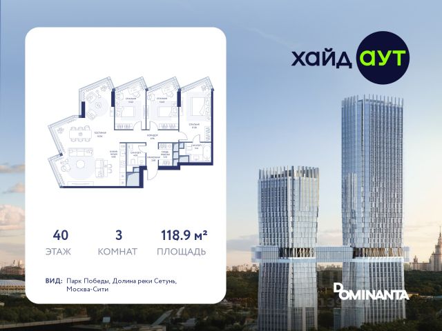 Прямая продажа от застройщика! Продается 3-комнатная квартира площадью 129 кв.м. на 33-м этаже 34-этажного дома в жилом комплексе ХАЙДАУТ с панорамными видами: Парк Победы, Долина реки Сетунь, МГУ, Москва-Сити, Воробьевы горы. Высота потолков 3,25 м. В ХАЙДАУТ доступны различные условия покупки — от специальных предложений при полной оплате до комфортных программ рассрочки и индивидуальных ипотечных решений. ХАЙДАУТ — премиальный проект компании Dominanta. Это новый уровень жизни и комфорта без компромиссов. Две башни — 34 и 49 этажей — открывают захватывающие виды на Москву. Архитектурной доминантой проекта становится мост, соединяющий башни на высоте 80 метров. Закрытая территория, охрана 24/7, зона экстренной безопасности на подземном уровне, система пожаротушения. На мосту между башнями на 22-м этаже находится общественное пространство SocialHUB — предусмотрено 16 комфортных пространств для работы, отдыха и развлечений с панорамными видами и клубным форматом доступа. Концепция благоустройства ХАЙДАУТ — баланс между природой и технологичным городом будущего. На территории сада предусмотрены 15 зон для отдыха, работы, спорта и детей. Знаковым местом станет центральная площадь с амфитеатром и водопадом — сочетание камней, растений и струящейся воды создает идеальный баланс с природой. Застройщик АО "СЗ "ХАЙДАУТ", ИНН 7729058636, ОГРН 1027739319420. Проектная декларация на сайте наш.дом.рф. Предложение не является публичной офертой.