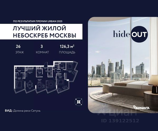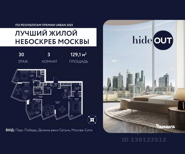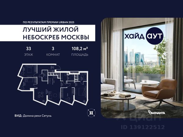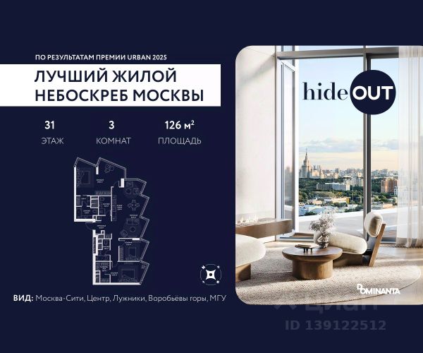 Прямая продажа от застройщика. Продается 3-комнатная квартира площадью 101.6 кв.м. на 5-м этаже 34-этажного дома в ЖК hideOUT с панорамными видами: Центр, Лужники, Воробьёвы горы, МГУ. Высота потолков 3,25 м. hideOUT — премиальный проект компании Dominanta. Это новый уровень жизни и комфорта без компромиссов. Две башни — 34 и 49 этажей — открывают захватывающие виды на Москву. Архитектурной доминантой проекта становится мост, соединяющий башни на высоте 80 метров. Закрытая территория, охрана 24/7, зона экстренной безопасности на подземном уровне, система пожаротушения. На мосту между башнями на 22-м этаже находится SocialHUB — предусмотрено 16 комфортных пространств для работы, отдыха и развлечений с панорамными видами и клубным форматом доступа. Концепция благоустройства hideOUT — баланс между природой и технологичным городом будущего. На территории сада предусмотрены 15 зон для отдыха, работы, спорта и детей. Знаковым местом станет центральная площадь с амфитеатром и водопадом — сочетание камней, растений и струящейся воды создает идеальный баланс с природой. В проекте действуют привлекательные условия покупки: - скидка до 20% при 100% оплате стоимости лота и ипотеке без субсидирования. Предложение действует до 28.02.2026. - рассрочка 0% на 12 месяцев с первоначальным взносом 30% / на 18 месяцев с первоначальным взносом 50%. Застройщик АО "СЗ "ХАЙДАУТ", ИНН 7729058636, ОГРН 1027739319420. Проектная декларация на сайте наш.дом.рф. Предложение не является публичной офертой.